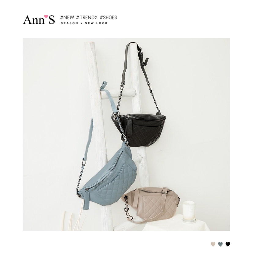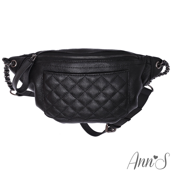 Ann’S簡約個性美-槍色鏈帶菱格真皮大容量腰包-黑