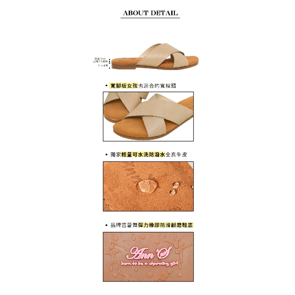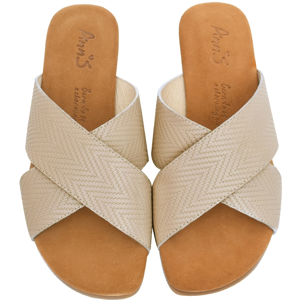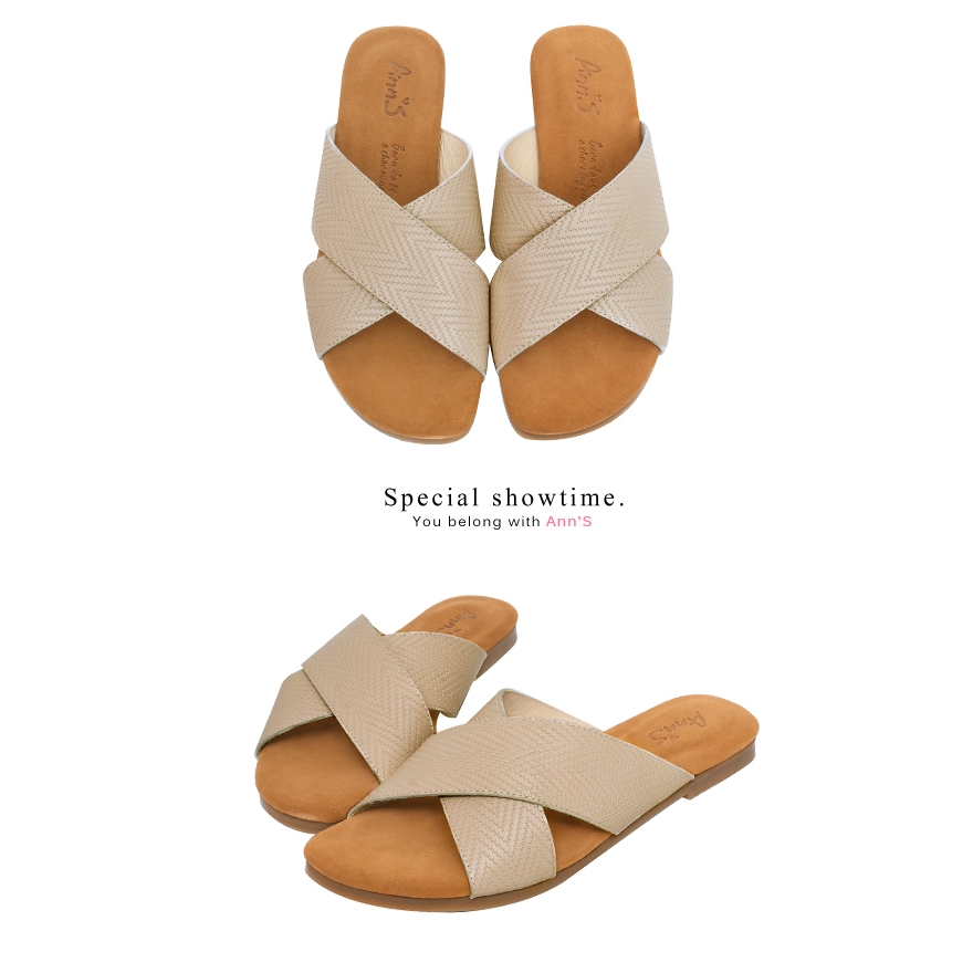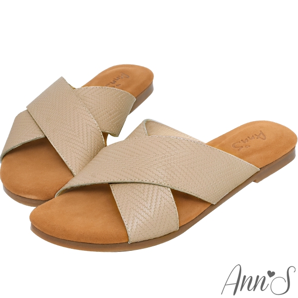 Ann’S水洗牛皮-人字壓紋交叉寬帶平底涼拖鞋-杏