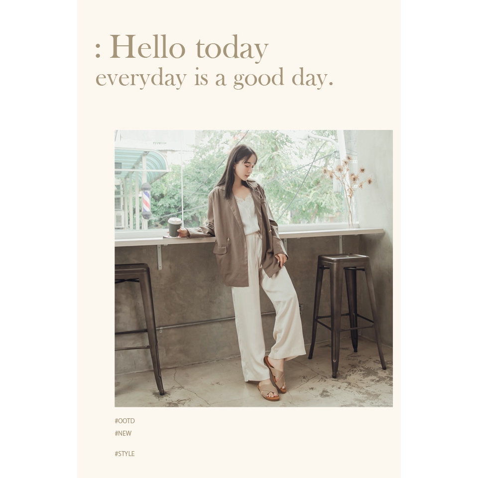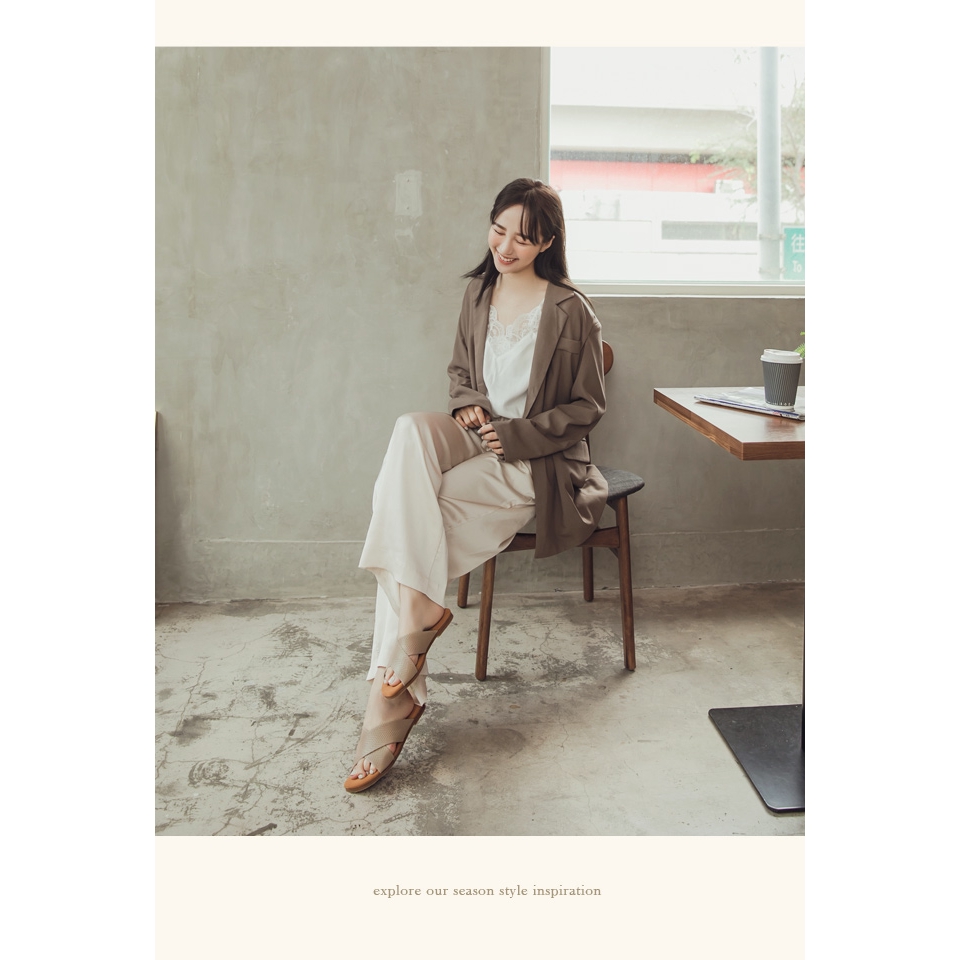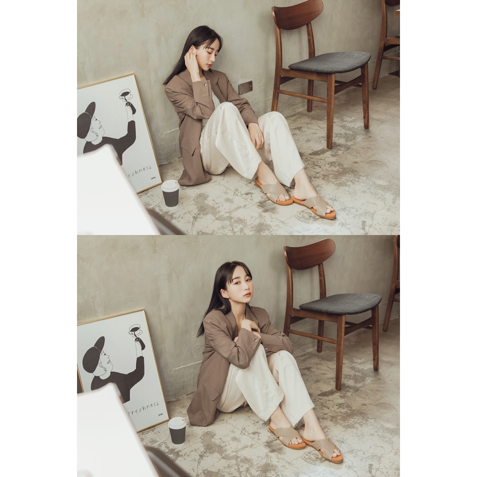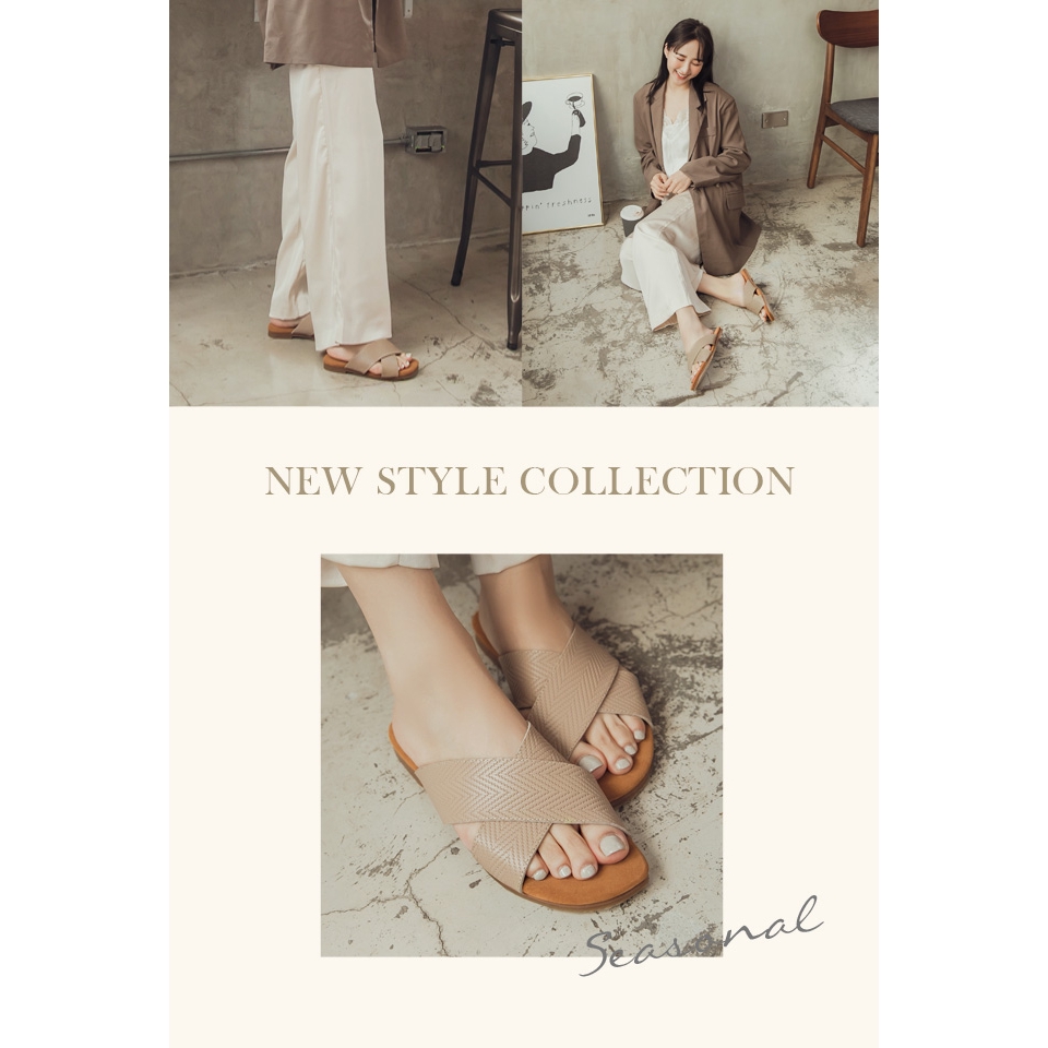 Ann’S水洗牛皮-人字壓紋交叉寬帶平底涼拖鞋-杏