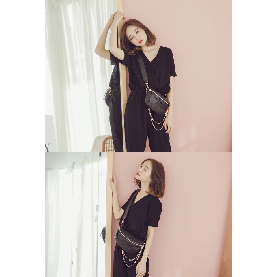 Ann’S真牛皮多way菱格金鍊腰包(背帶可調整)-黑