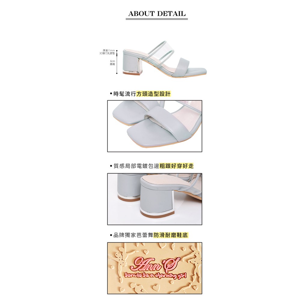 Ann’S青春保鮮日-低調電鍍包邊雙帶透明方頭粗跟涼拖鞋6cm-灰藍(版型偏小)