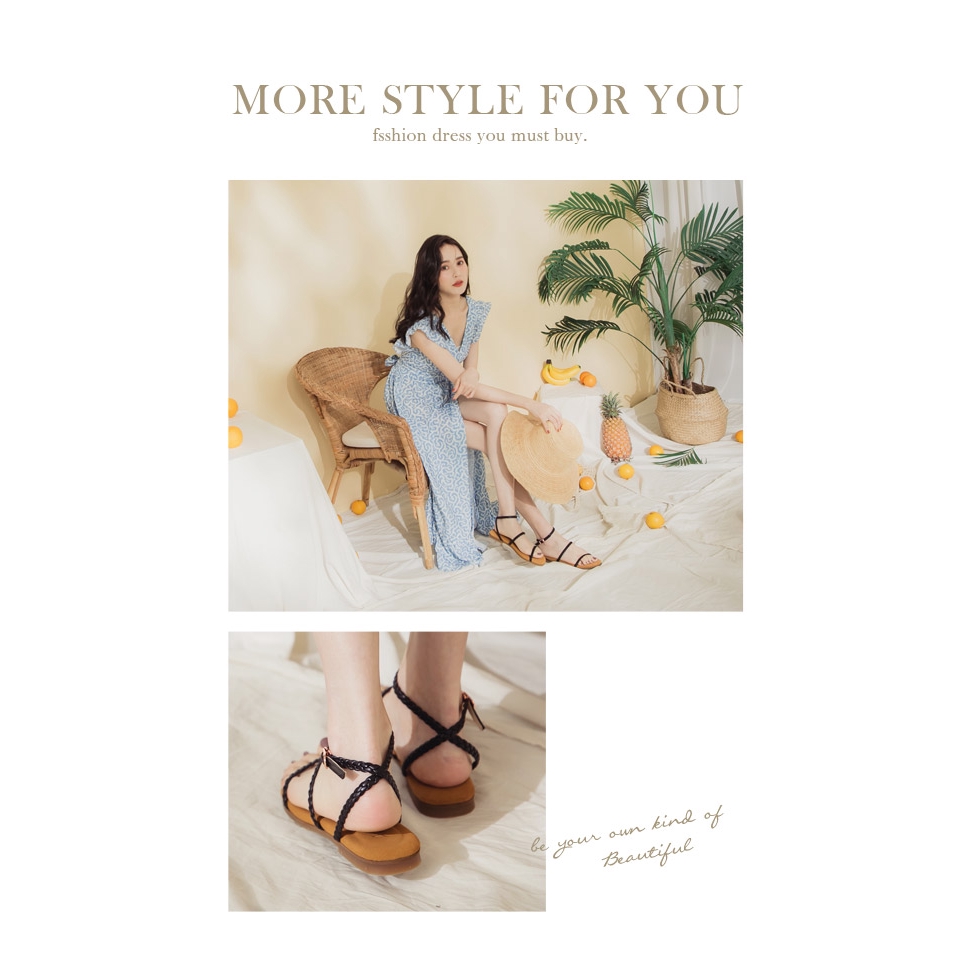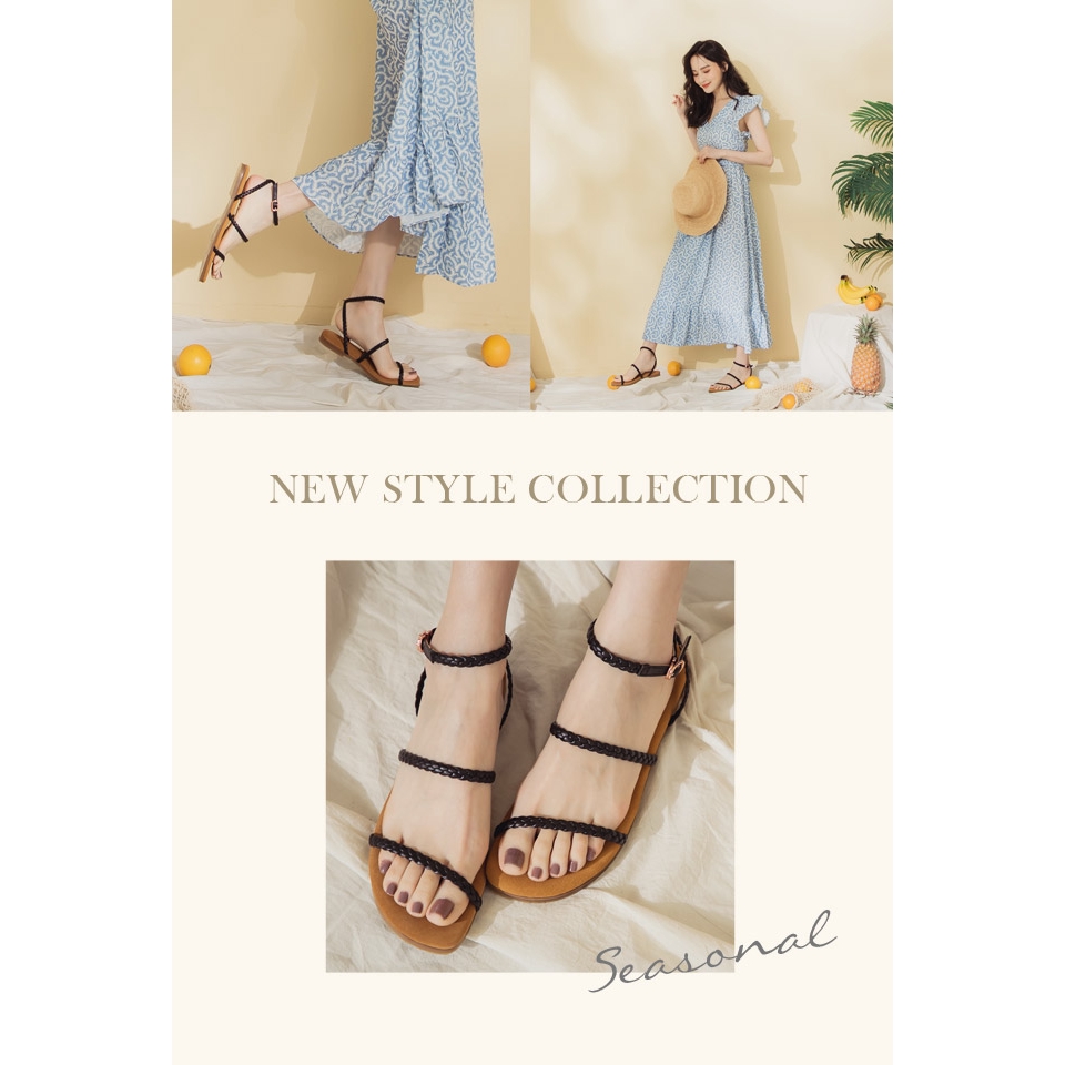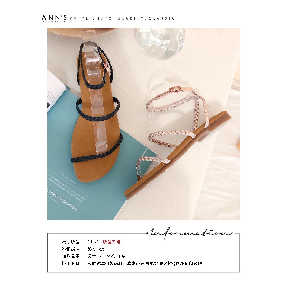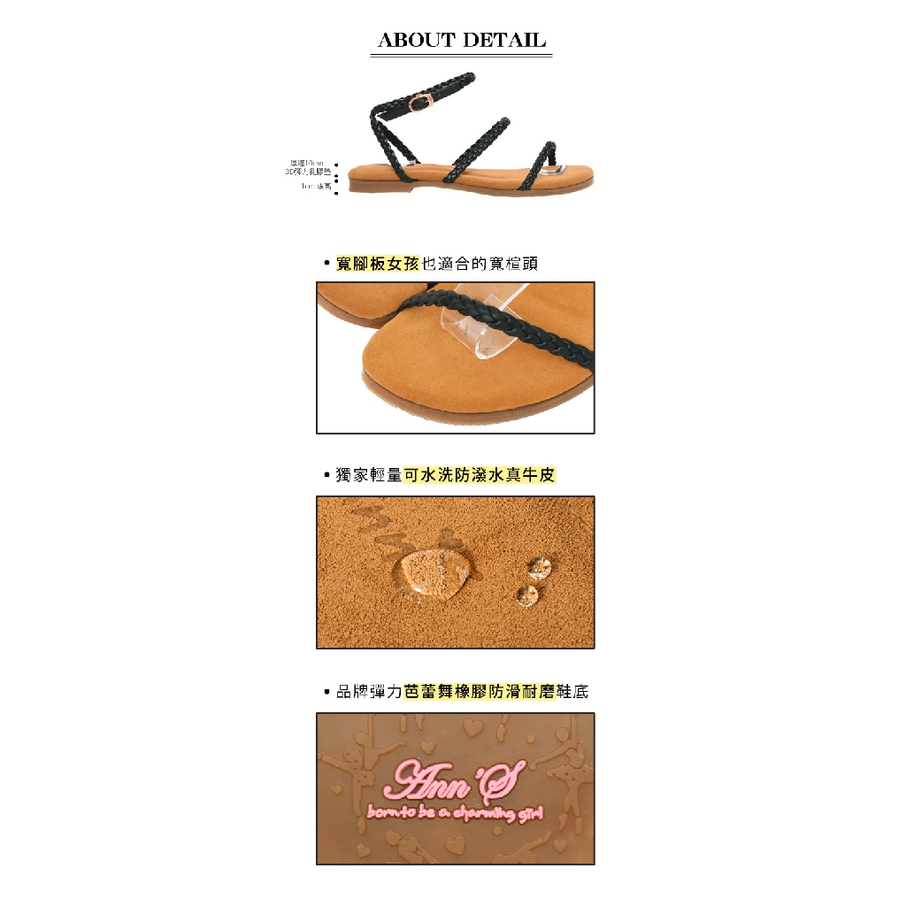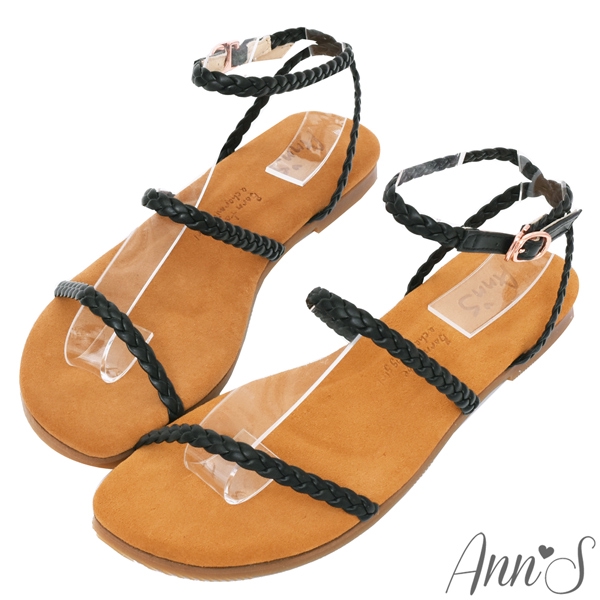 Ann’S水洗牛皮-腳踝繫帶編織平底涼鞋-黑