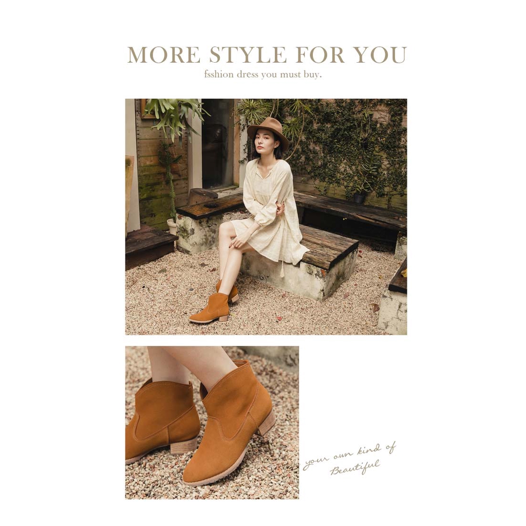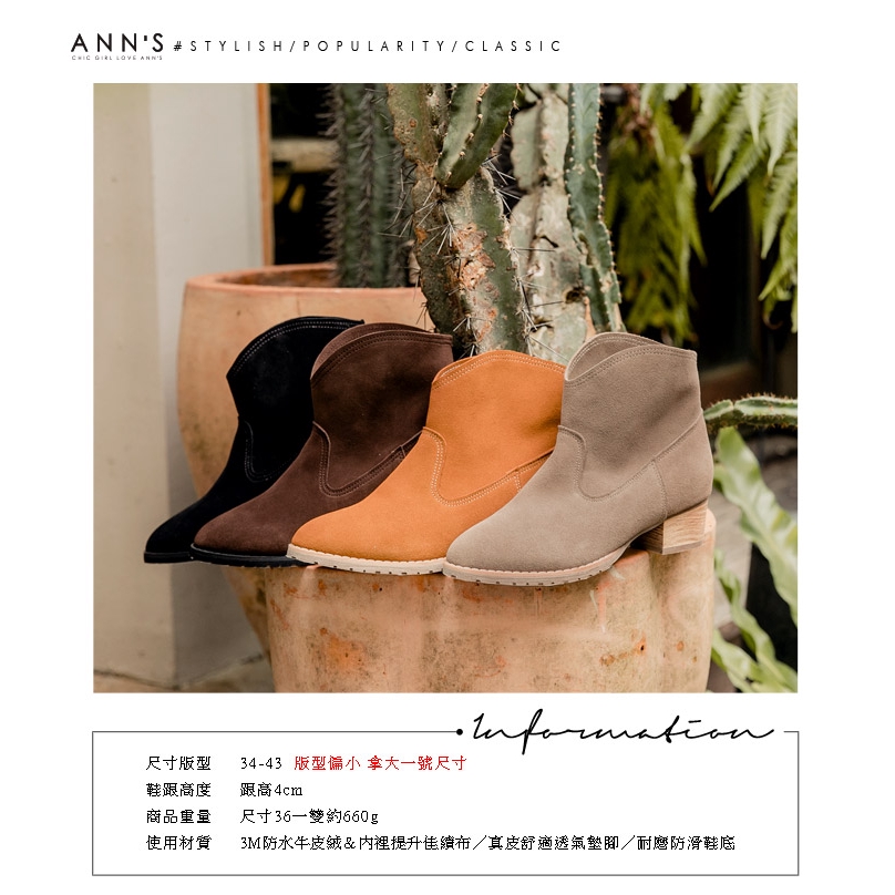 Ann’S美式風格-3M防水牛皮麂皮V口顯瘦粗跟西部短靴4cm-棕(版型偏小)