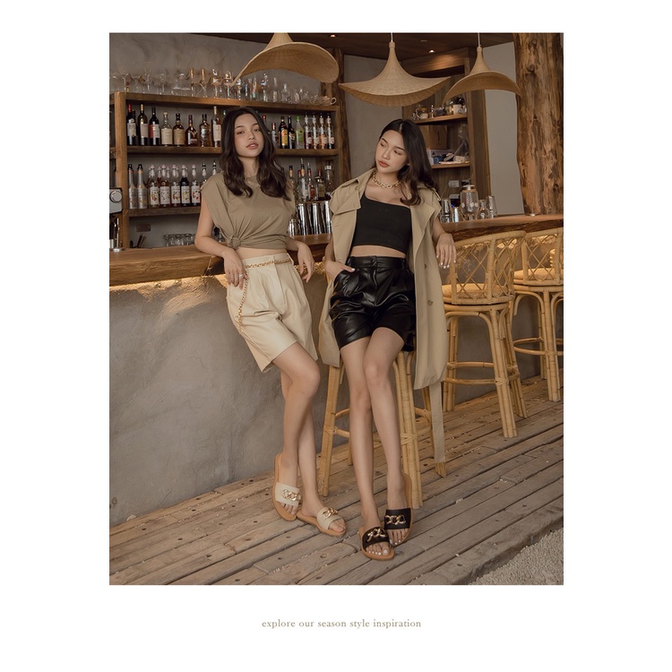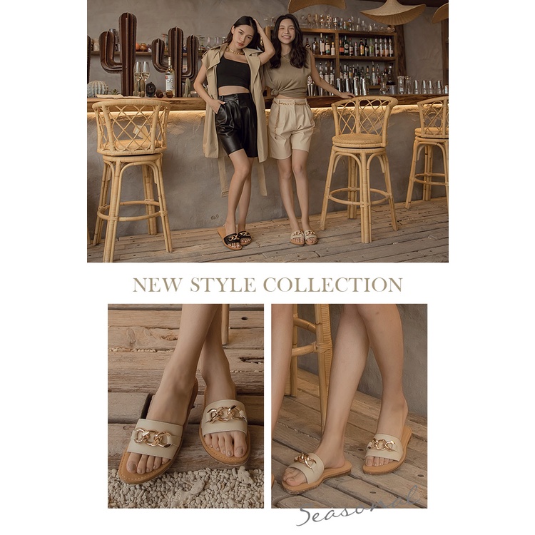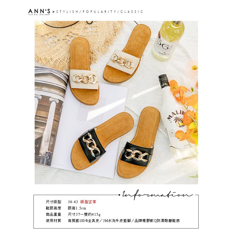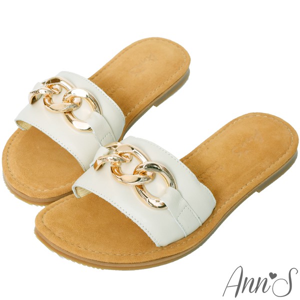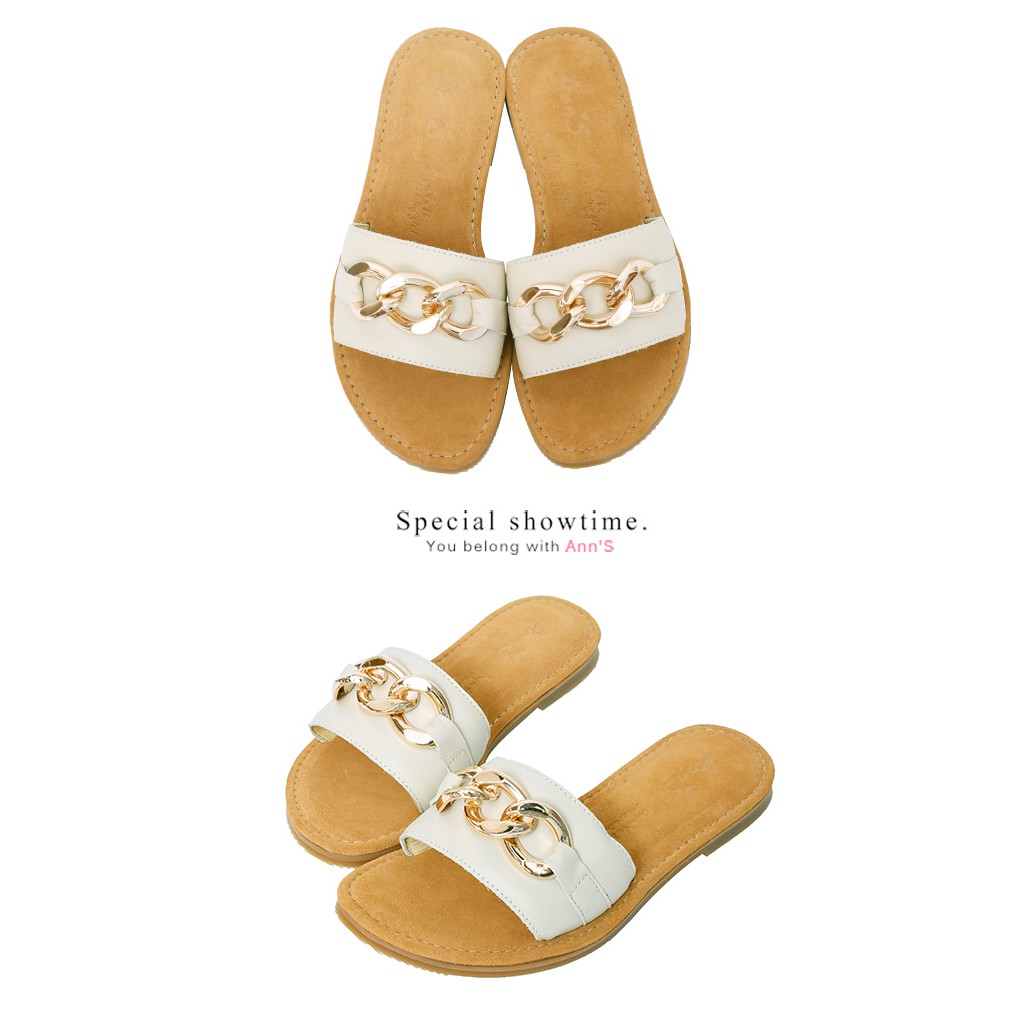 Ann’S水洗牛皮-金屬粗鍊條軟澎全真皮圓頭平底涼拖鞋-米白