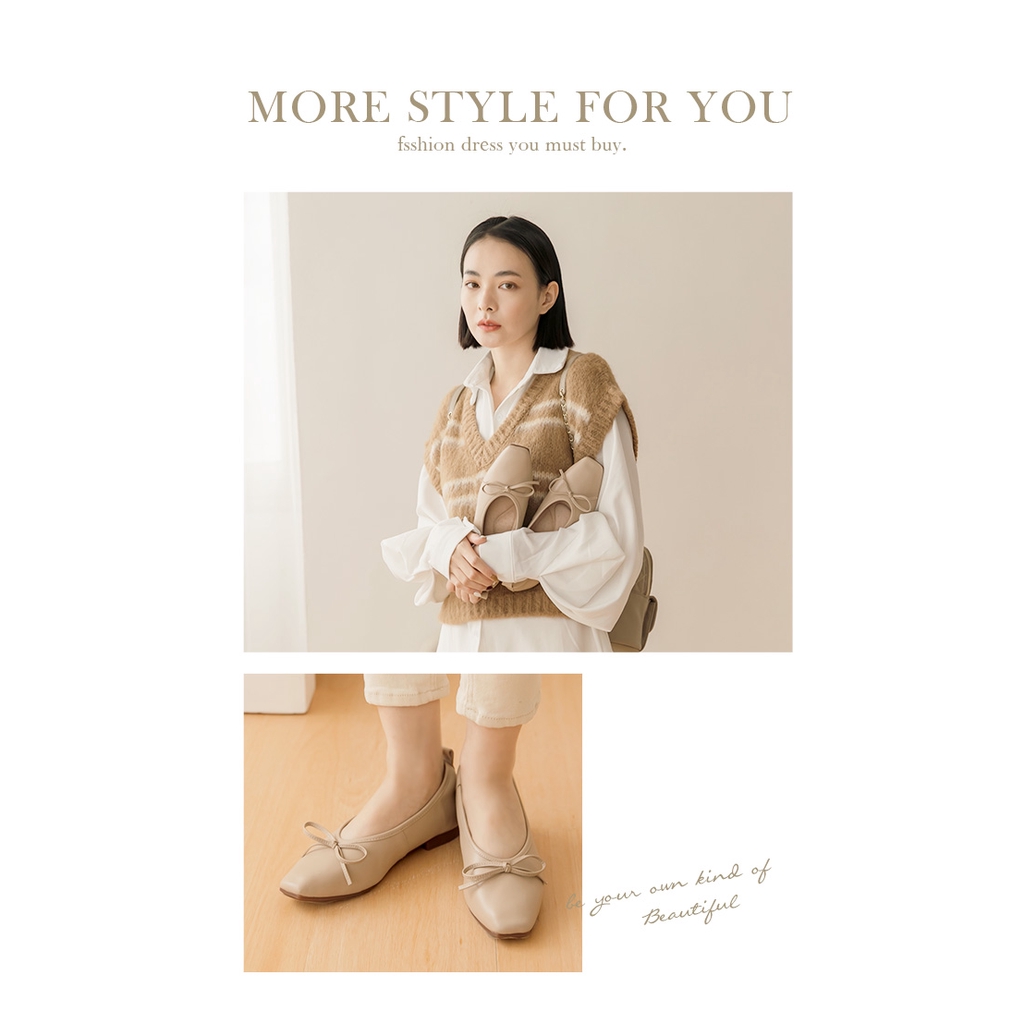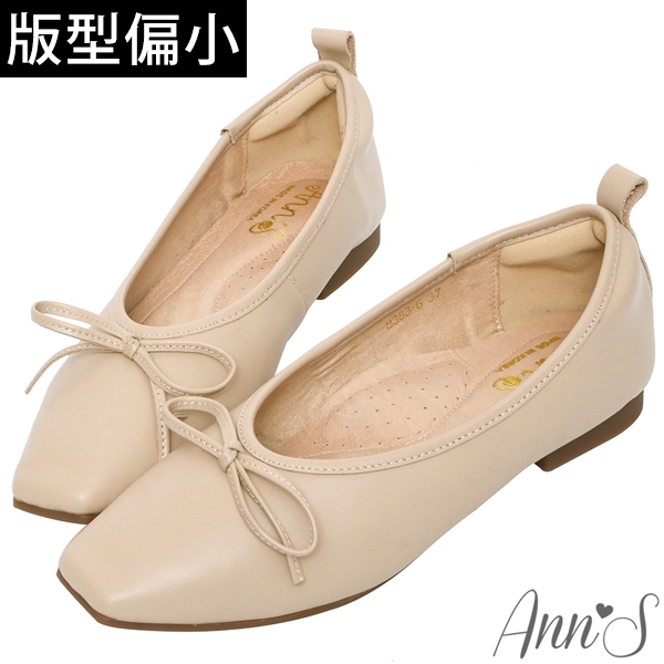 Ann’S法式平底鞋-柔軟全真皮蝴蝶結芭蕾小方頭鞋-杏(版型偏小)