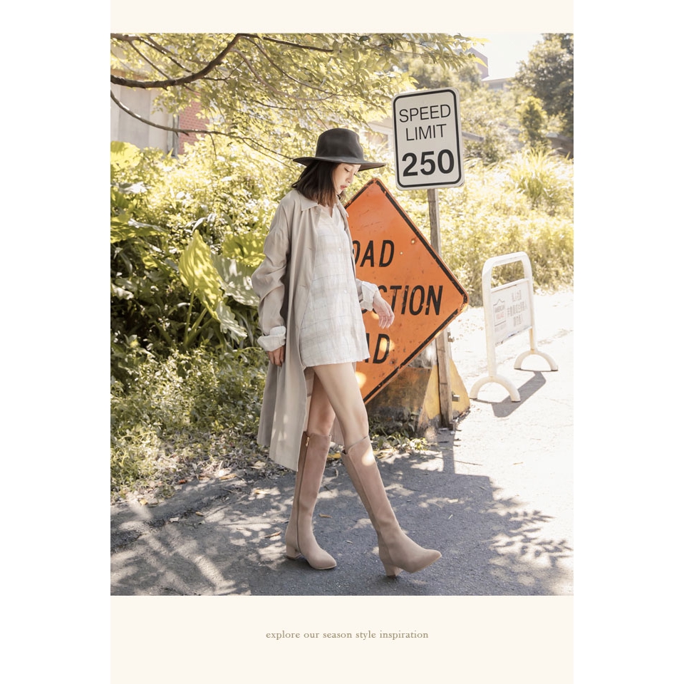 Ann’S返璞經典-前高後低防水絨布粗跟及膝長靴-杏