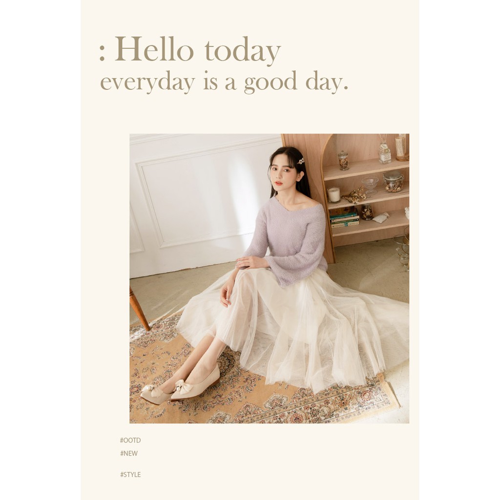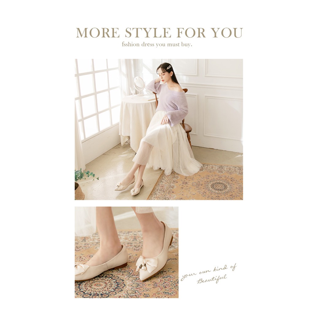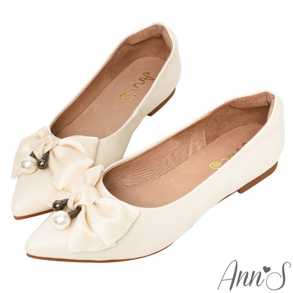 Ann’S紗質緞帶蝴蝶結珍珠扣全真皮尖頭平底包鞋-米白