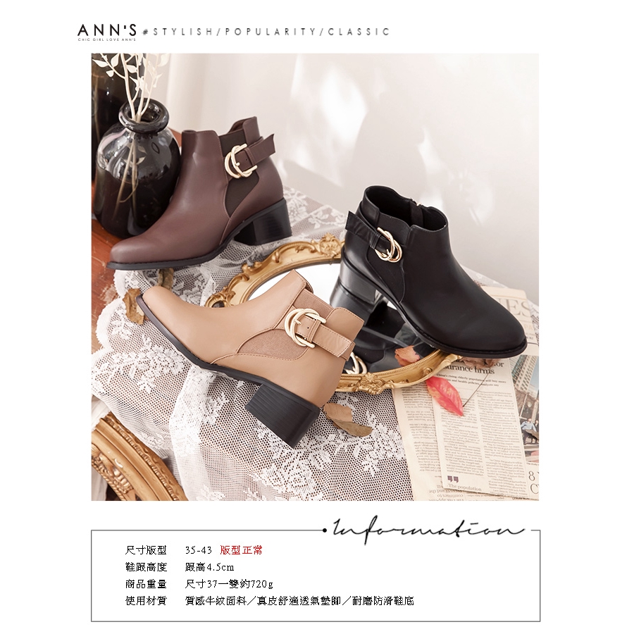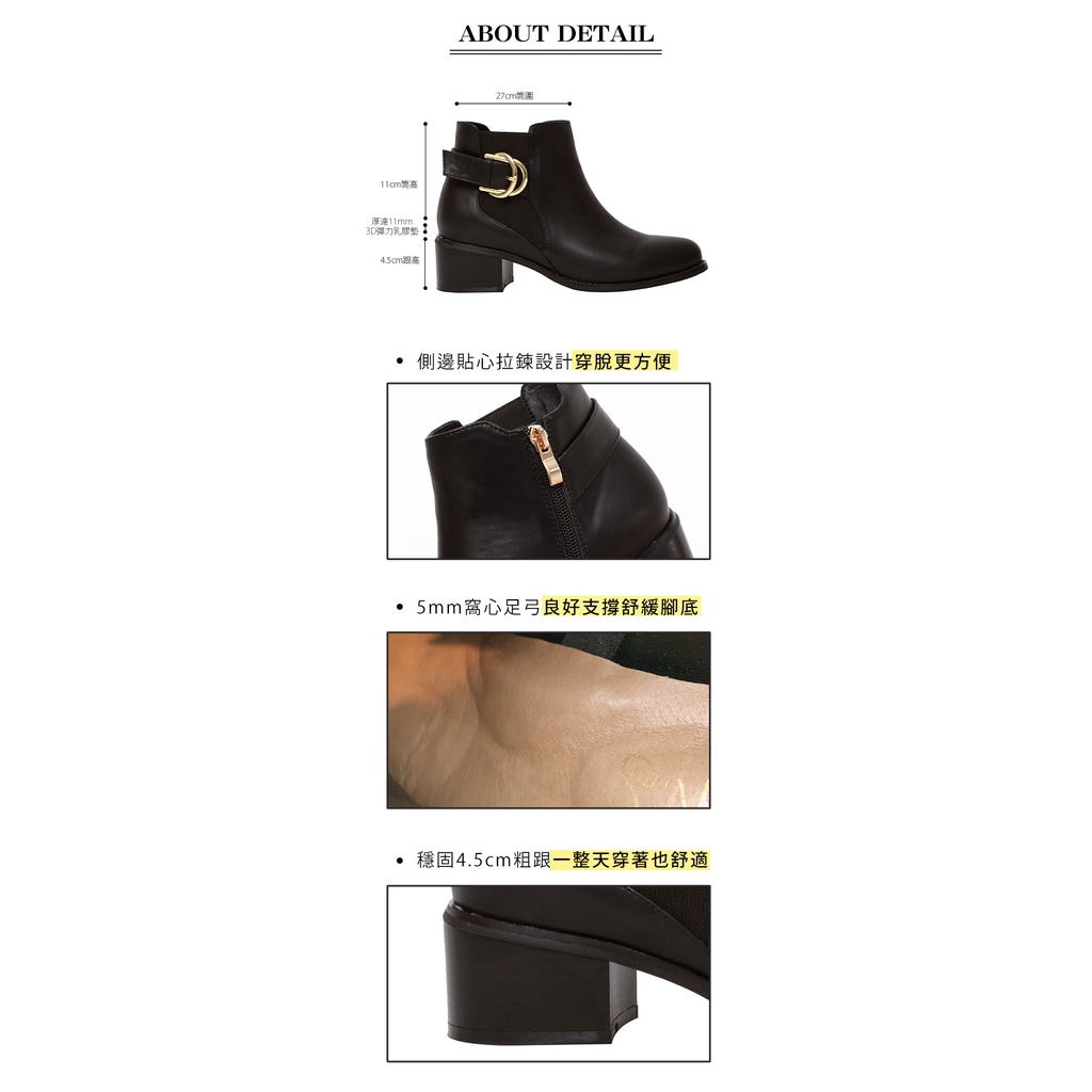 Ann’S時髦格調-側邊鬆緊雙層金色扣帶粗跟短靴4.5cm-黑