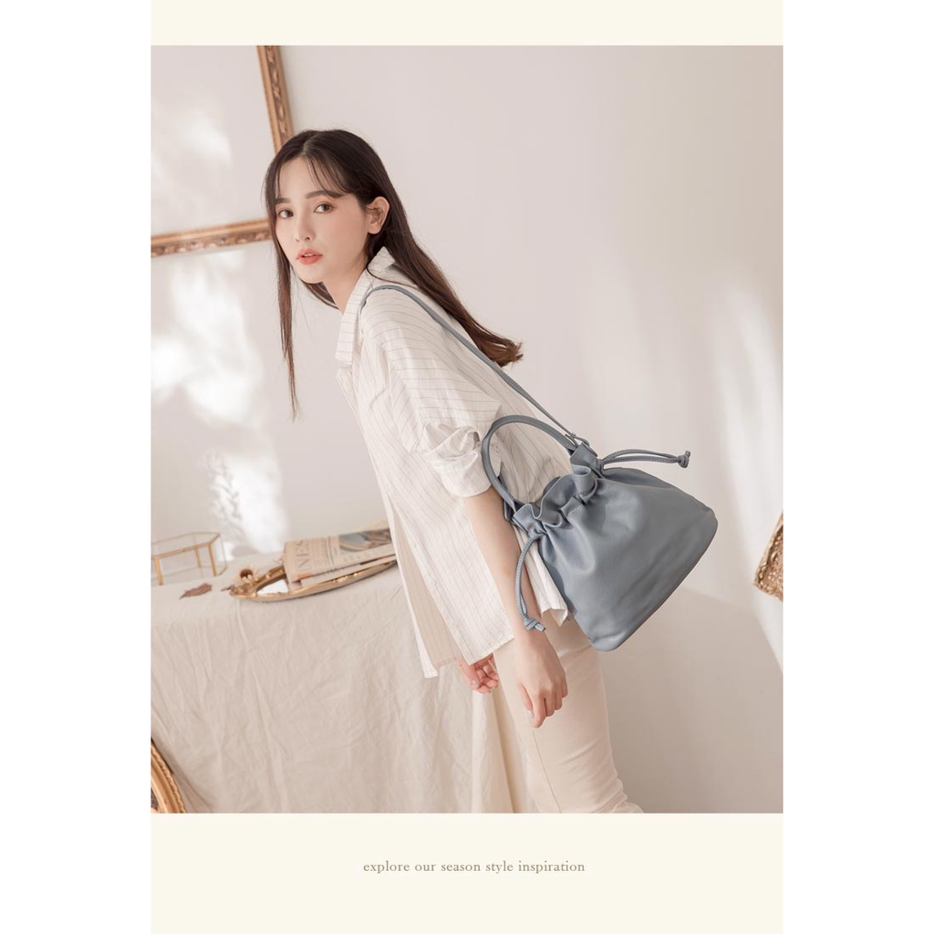 Ann’S可愛荷葉邊頭層牛皮多WAY束口水桶包-淺藍