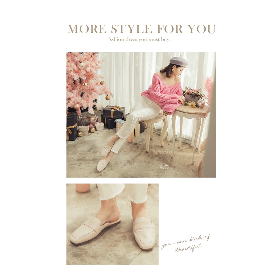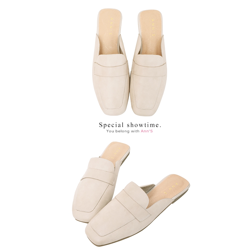 Ann’S軟綿舒適-復古打蠟真皮牛皮方頭穆勒平底拖鞋-米