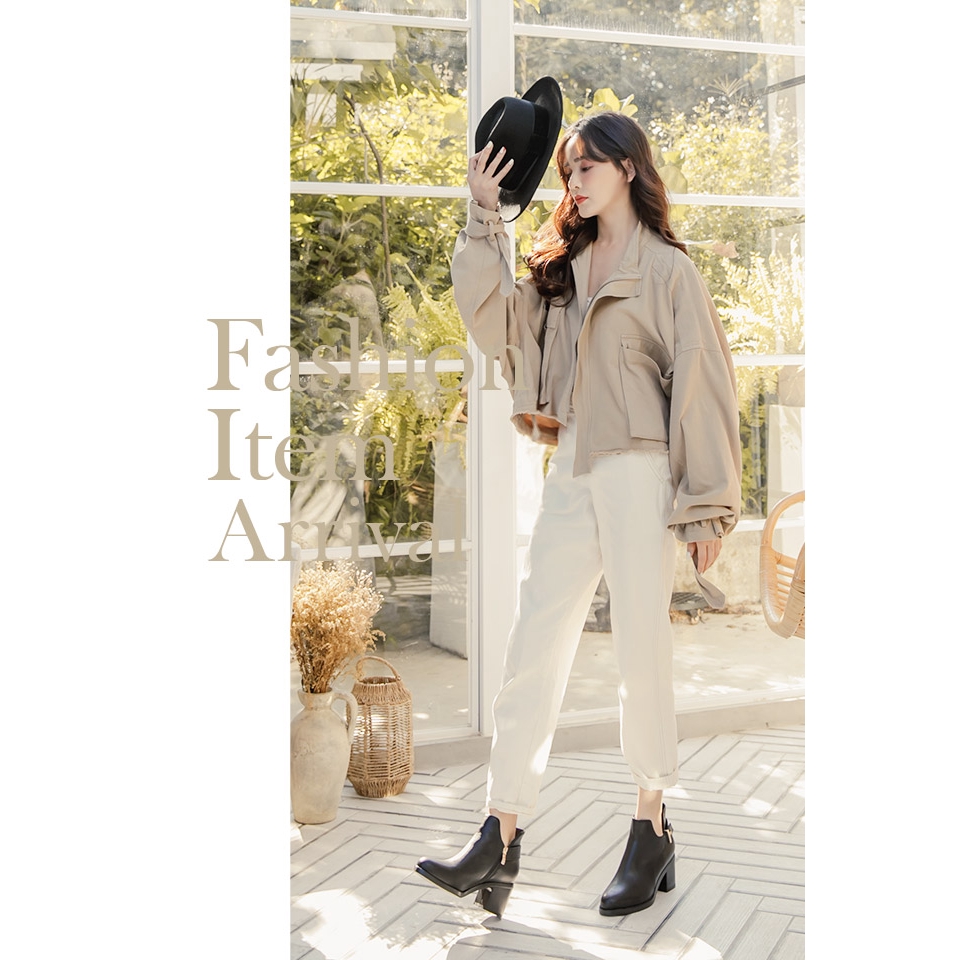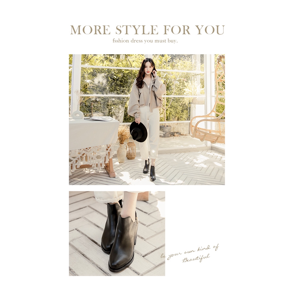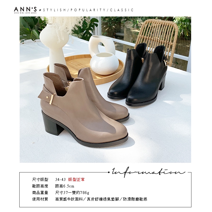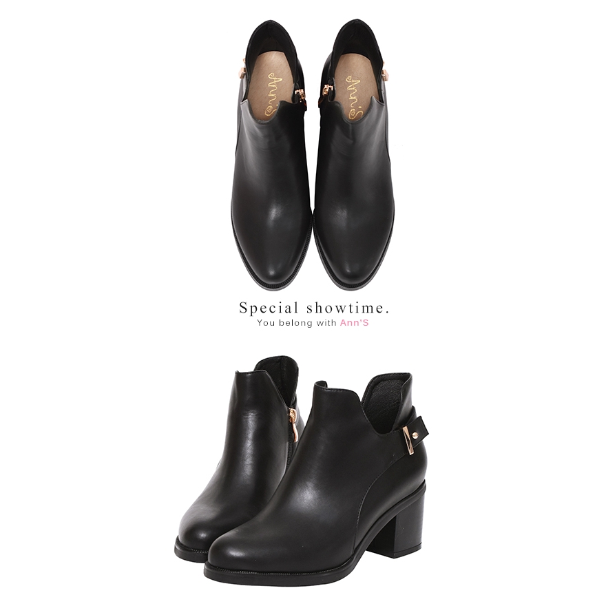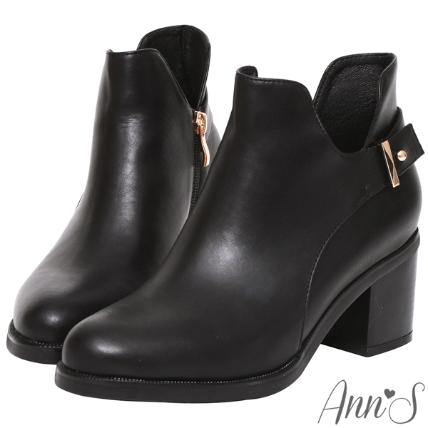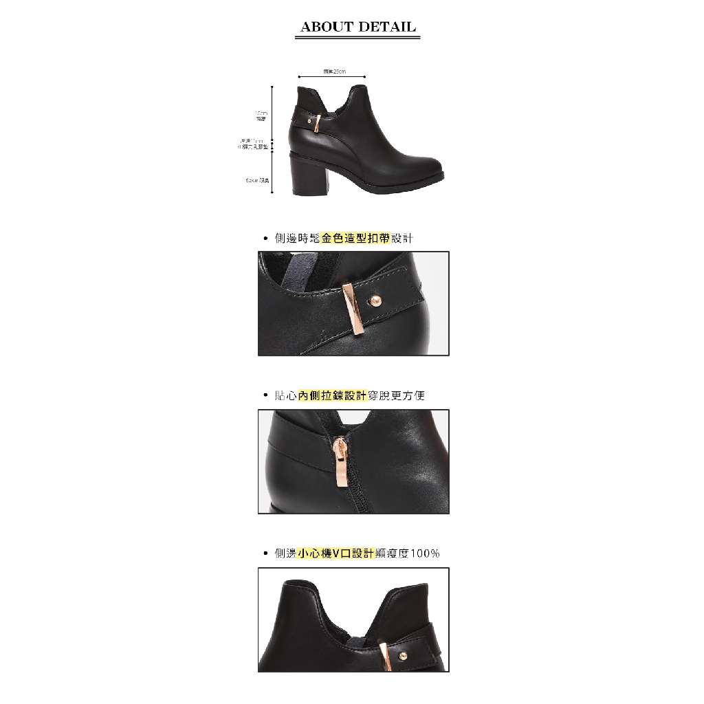 Ann’S摩登計畫-造型金扣帶側挖空V型超顯瘦粗跟短靴-黑