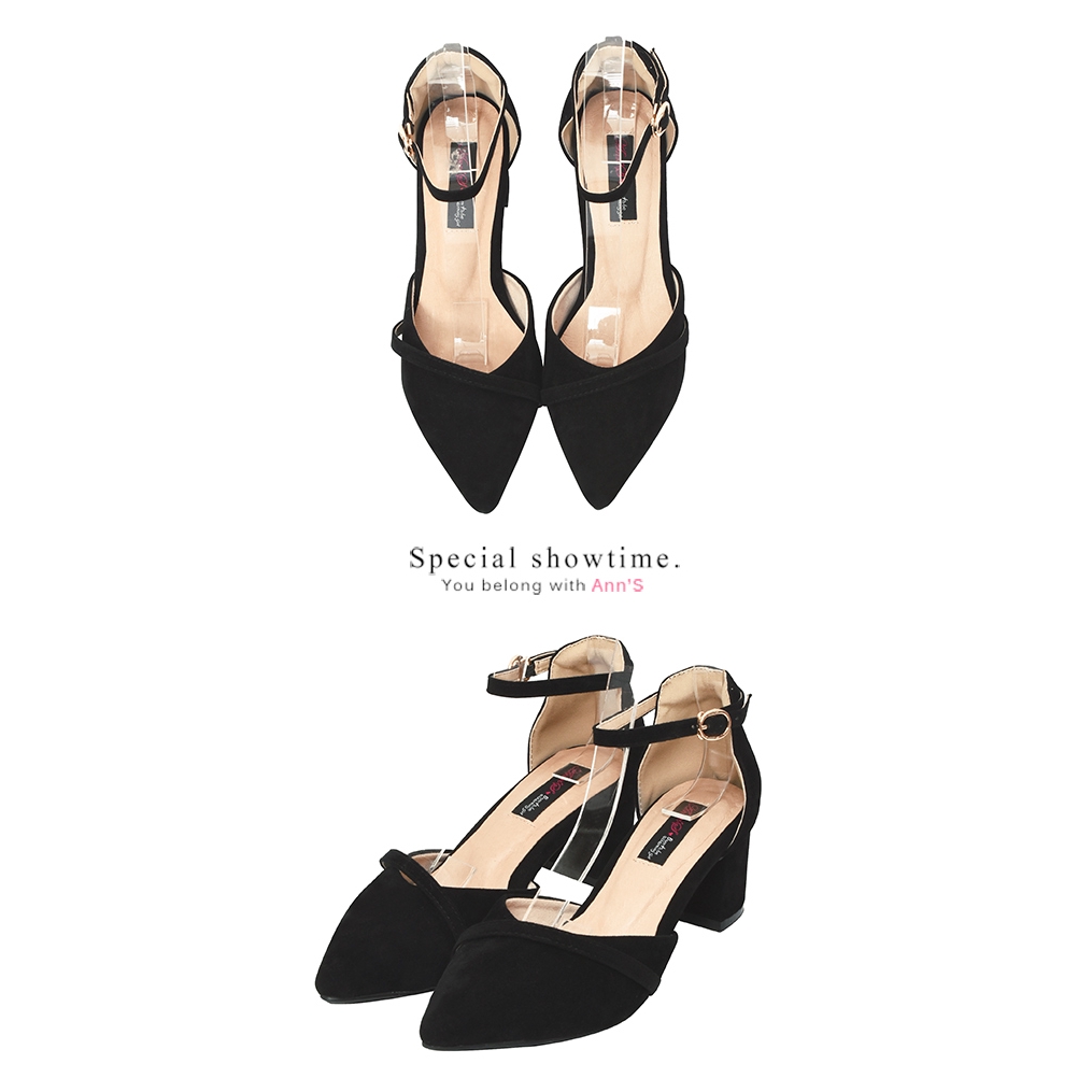 Ann’S柔美心動-絨面造型斜帶顯瘦繞踝粗跟尖頭鞋5.5cm-黑