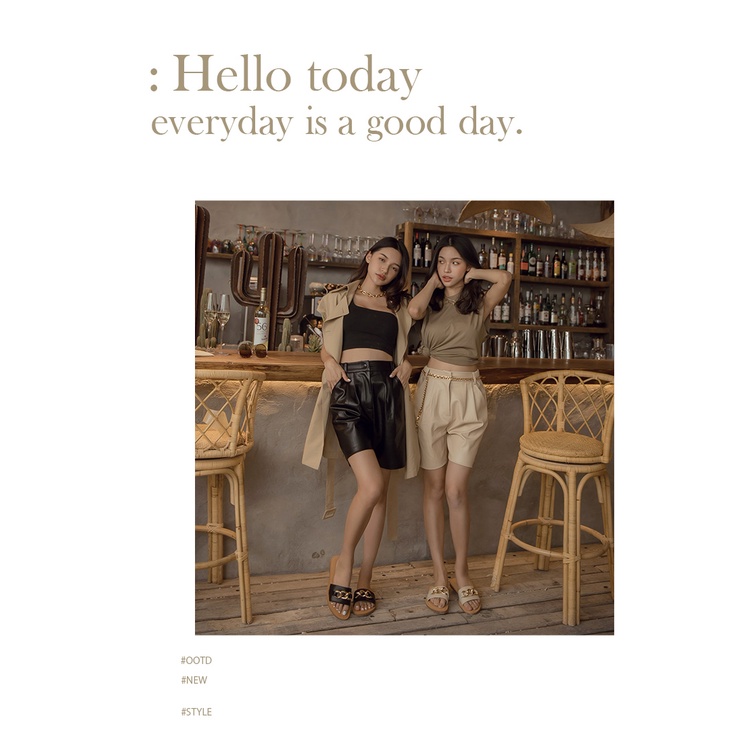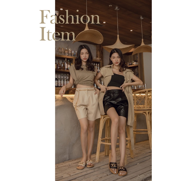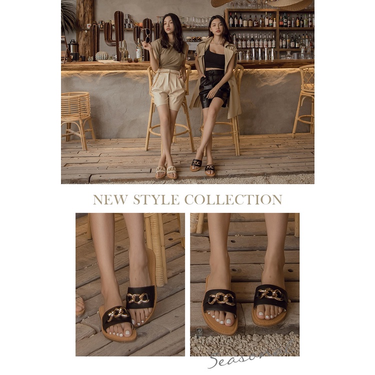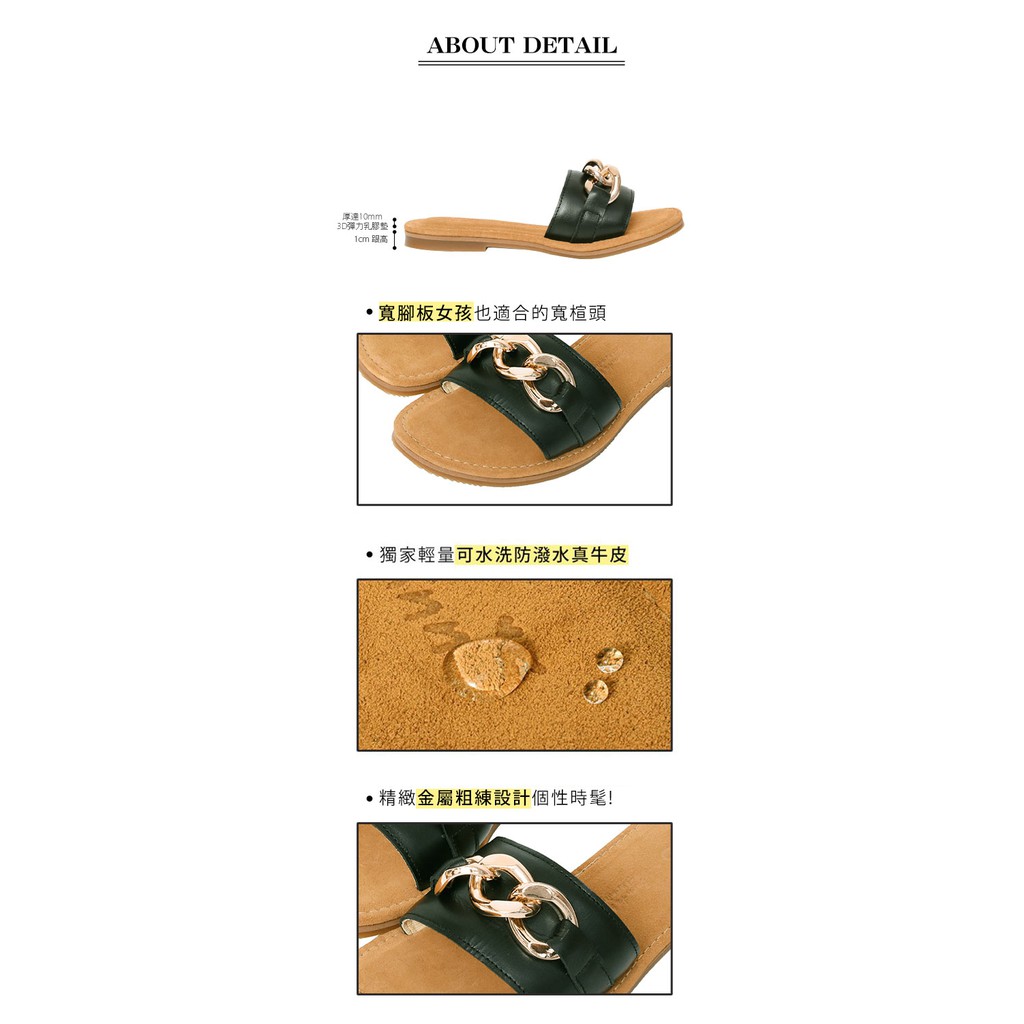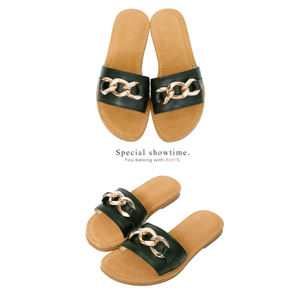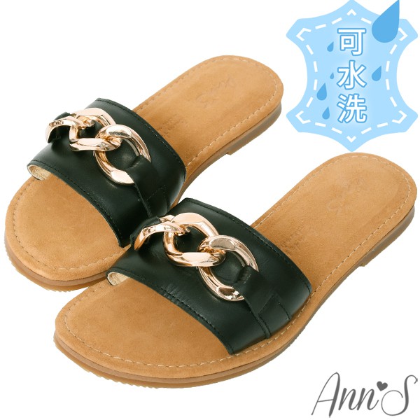 Ann’S水洗牛皮-金屬粗鍊條軟澎全真皮圓頭平底涼拖鞋-黑