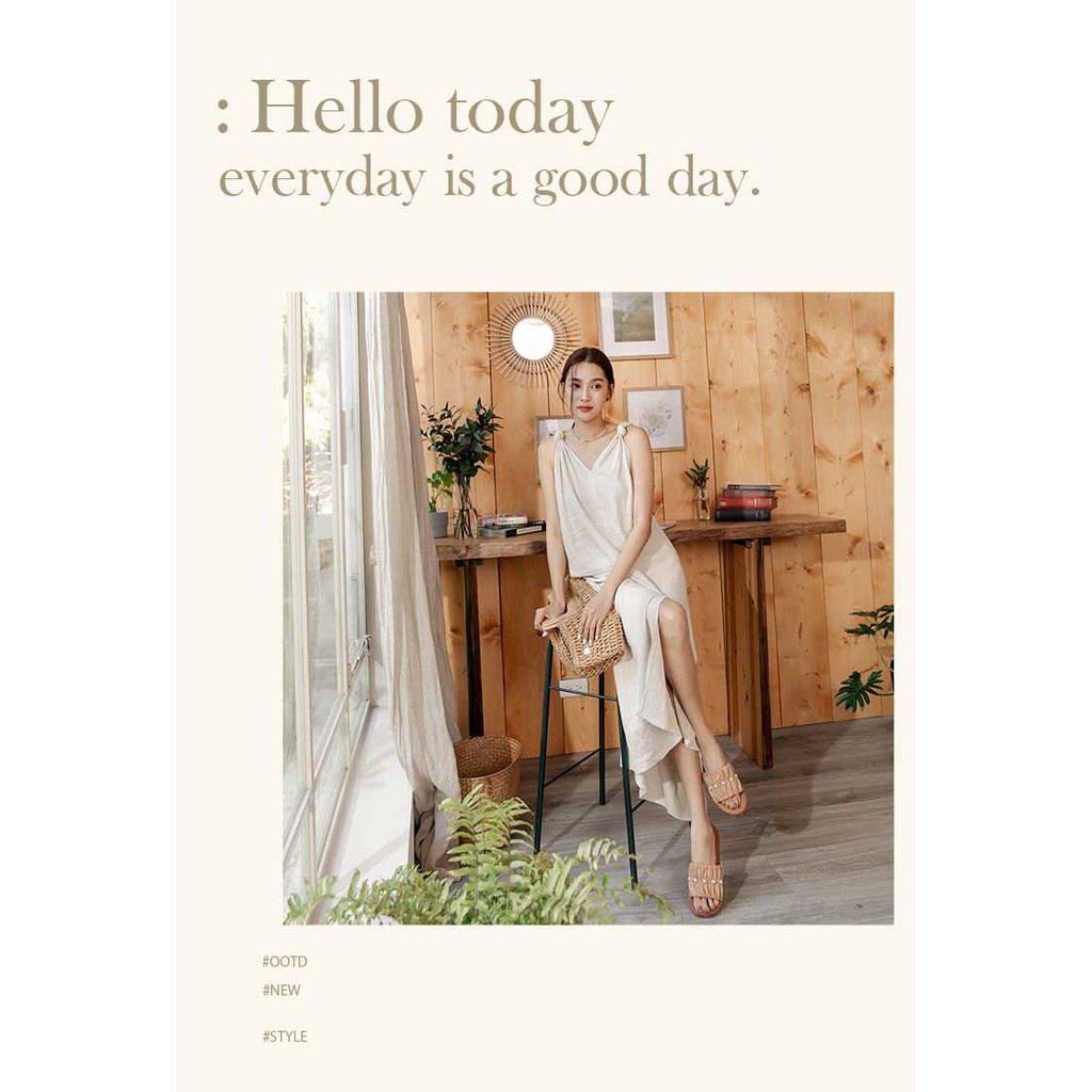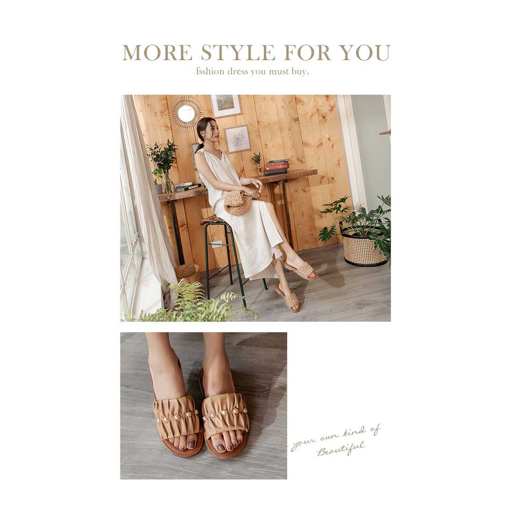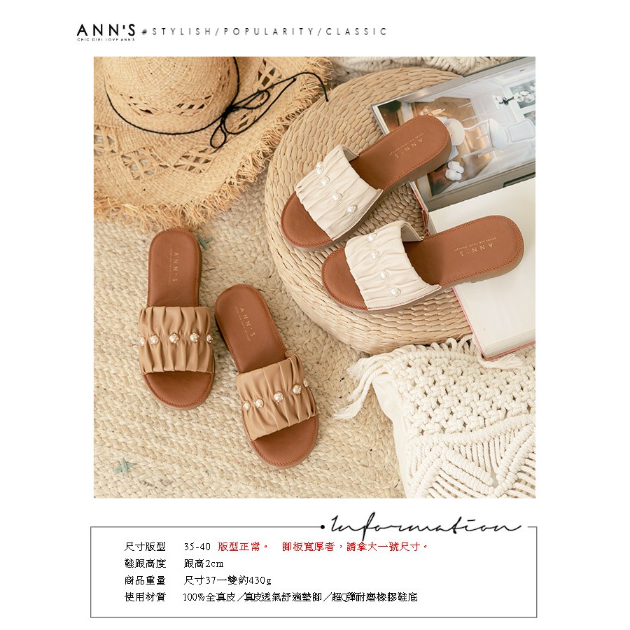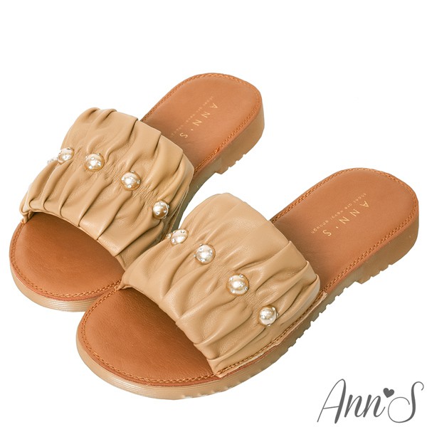 Ann’S名媛野餐局-全真皮抓皺珍珠碎鑽軟Q平底涼拖鞋-棕