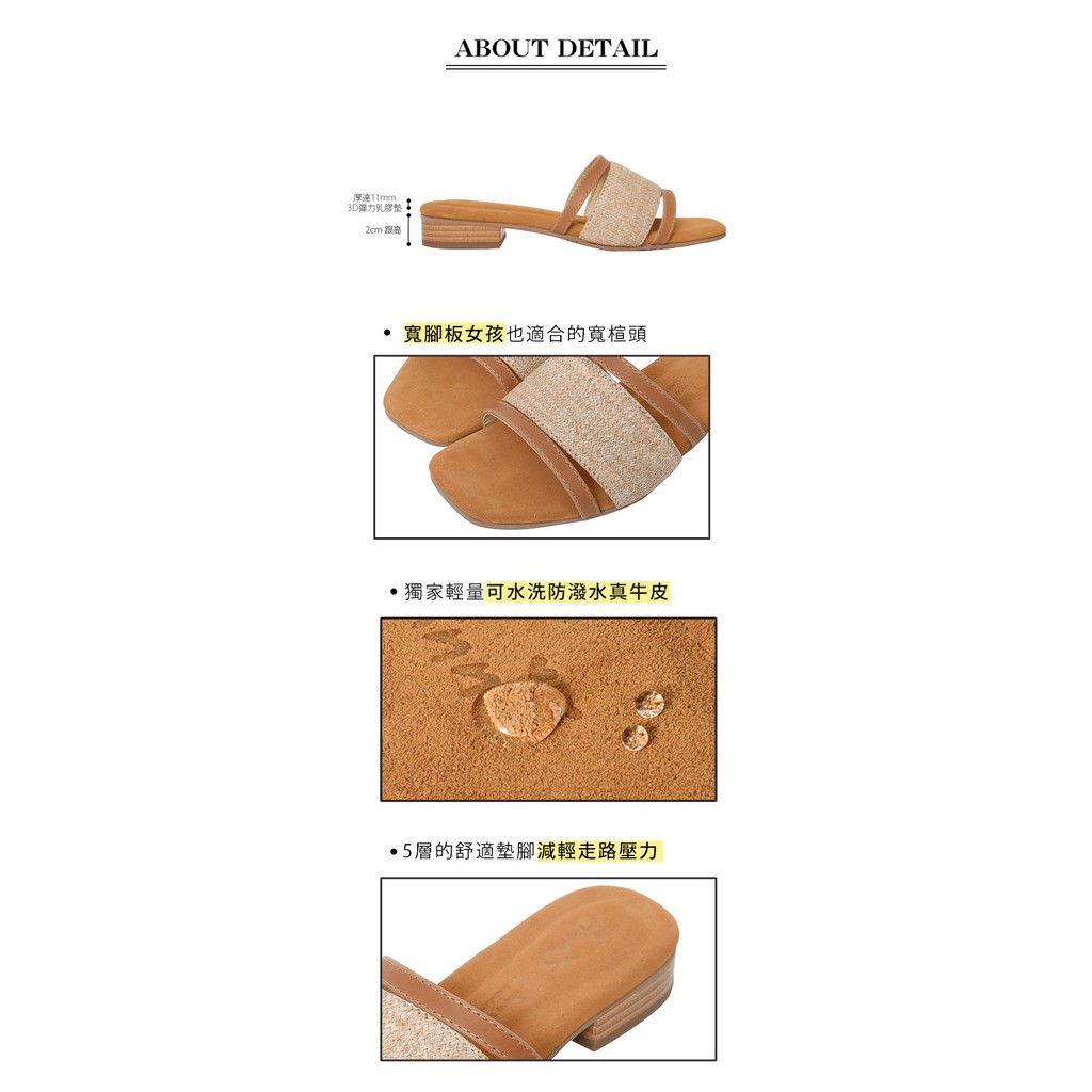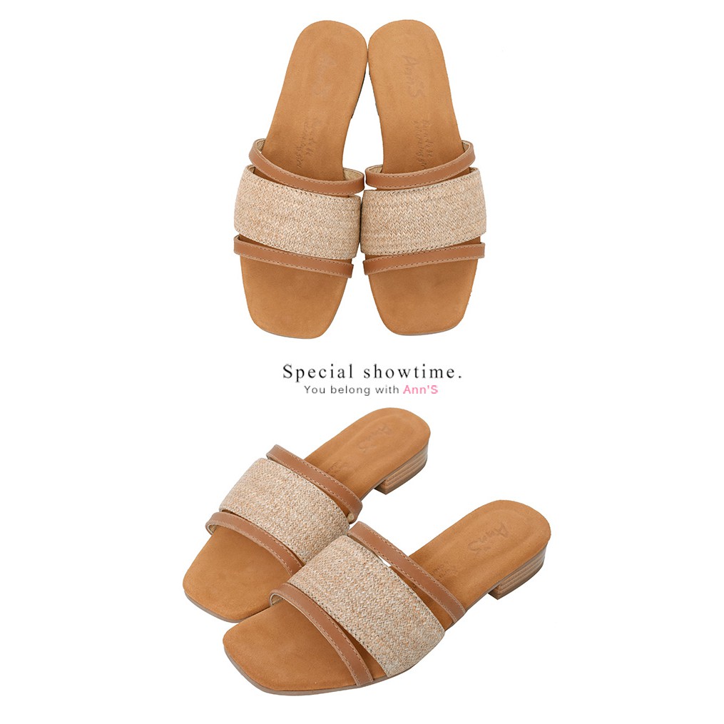 Ann’S水洗牛皮-小清新麻料木紋跟方頭涼拖鞋-棕