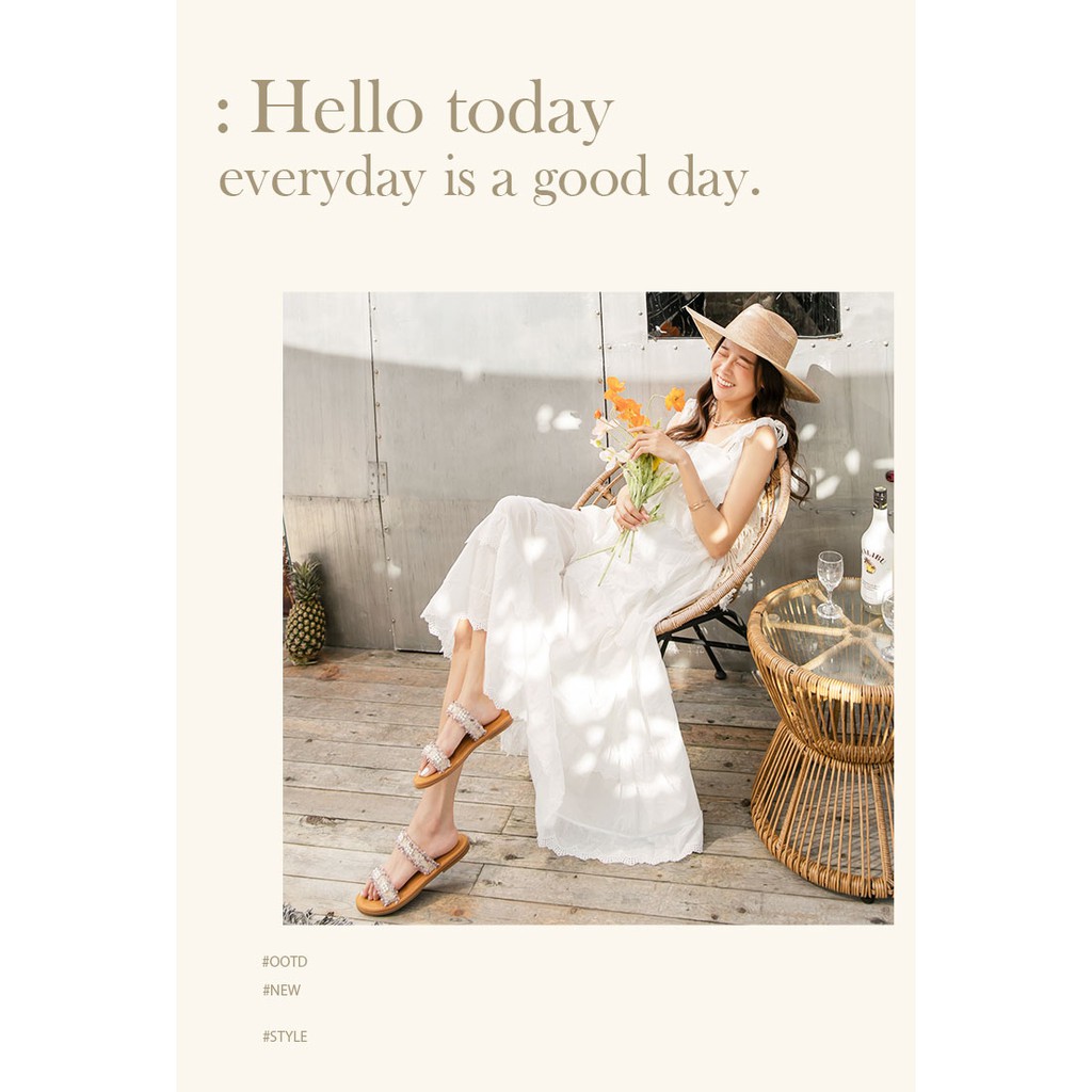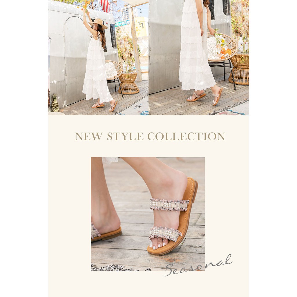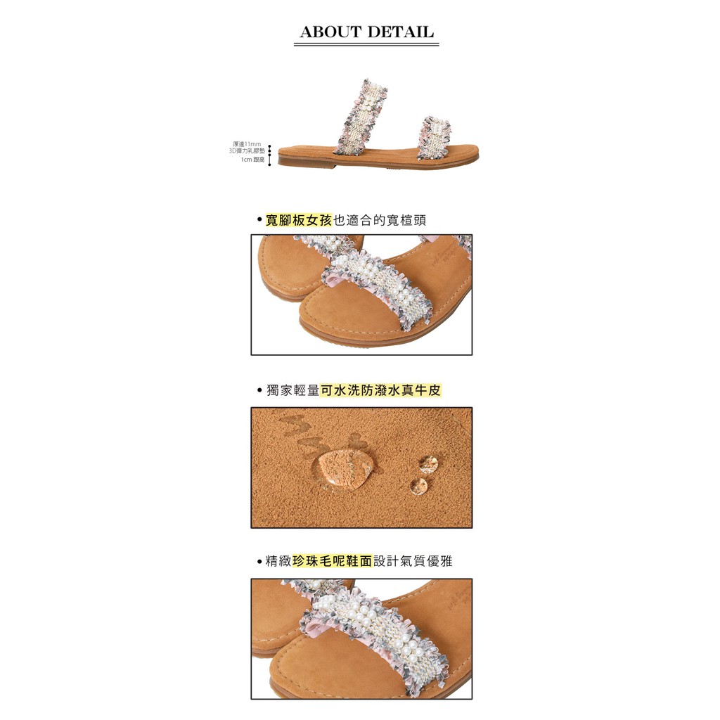Ann’S水洗牛皮-小香風珍珠流蘇混織圓頭平底涼拖鞋-粉