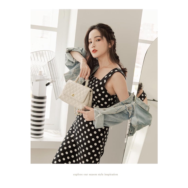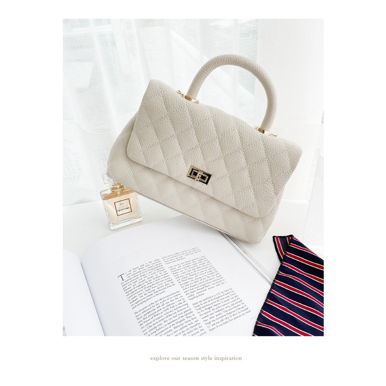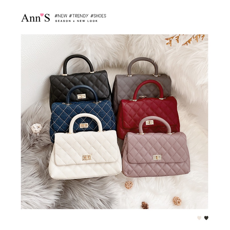 Ann’S法式優雅-全真皮牛皮手提把鍊條菱格紋包 -白