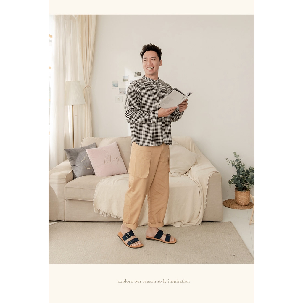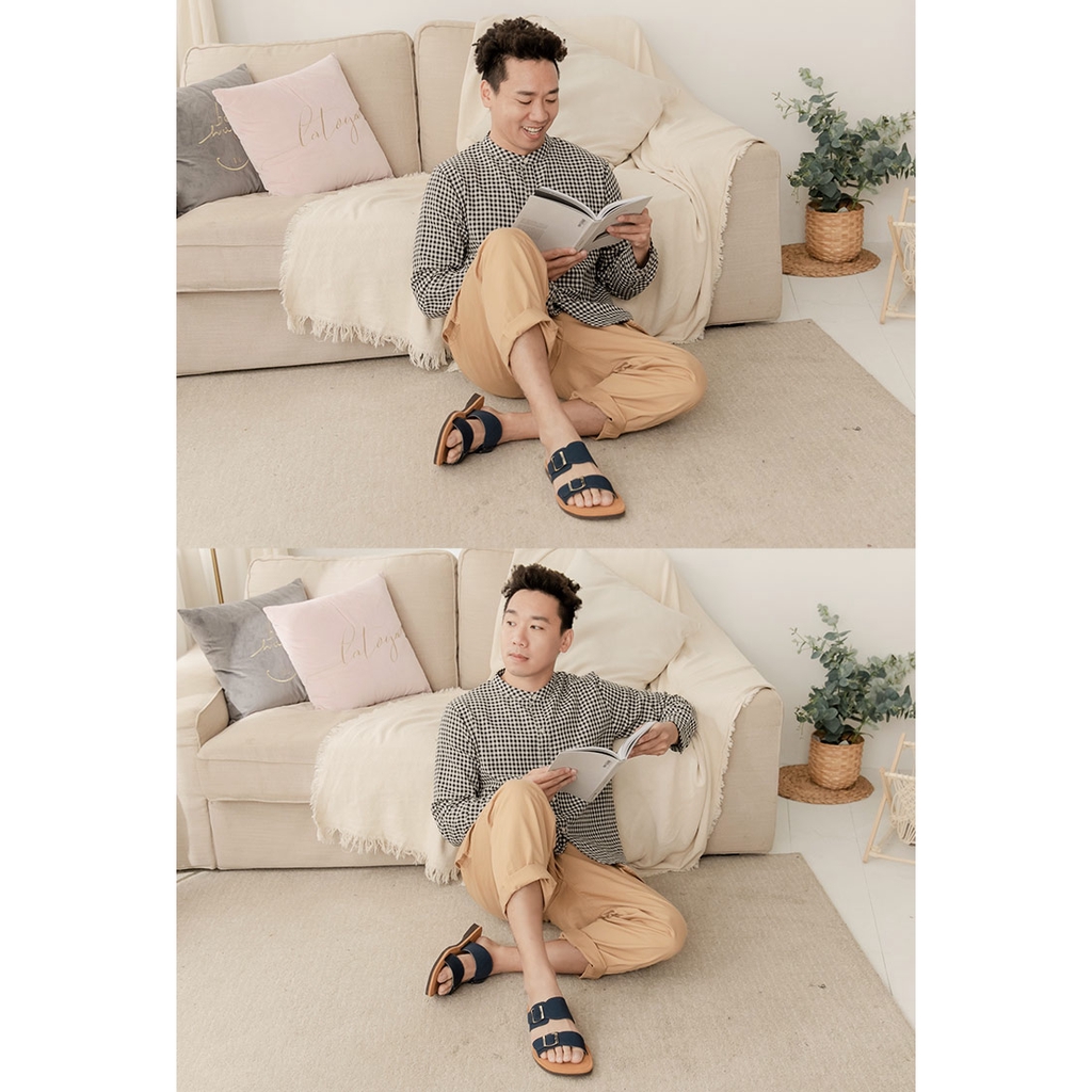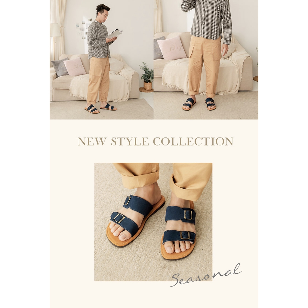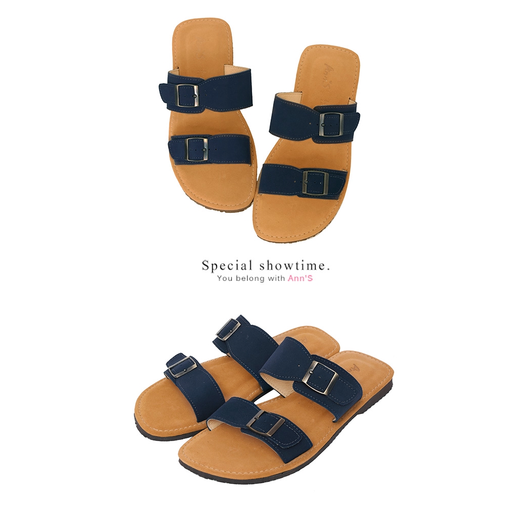 Ann’S水洗牛皮-男士復古雙扣帶涼拖鞋-深藍