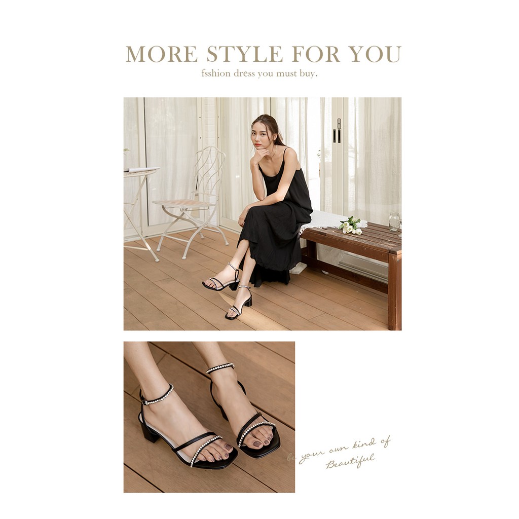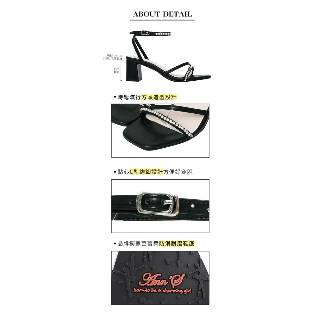 Ann’S散發光芒-顯瘦鑽石鍊帶方頭繫帶一字涼鞋6cm-黑