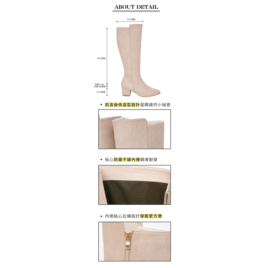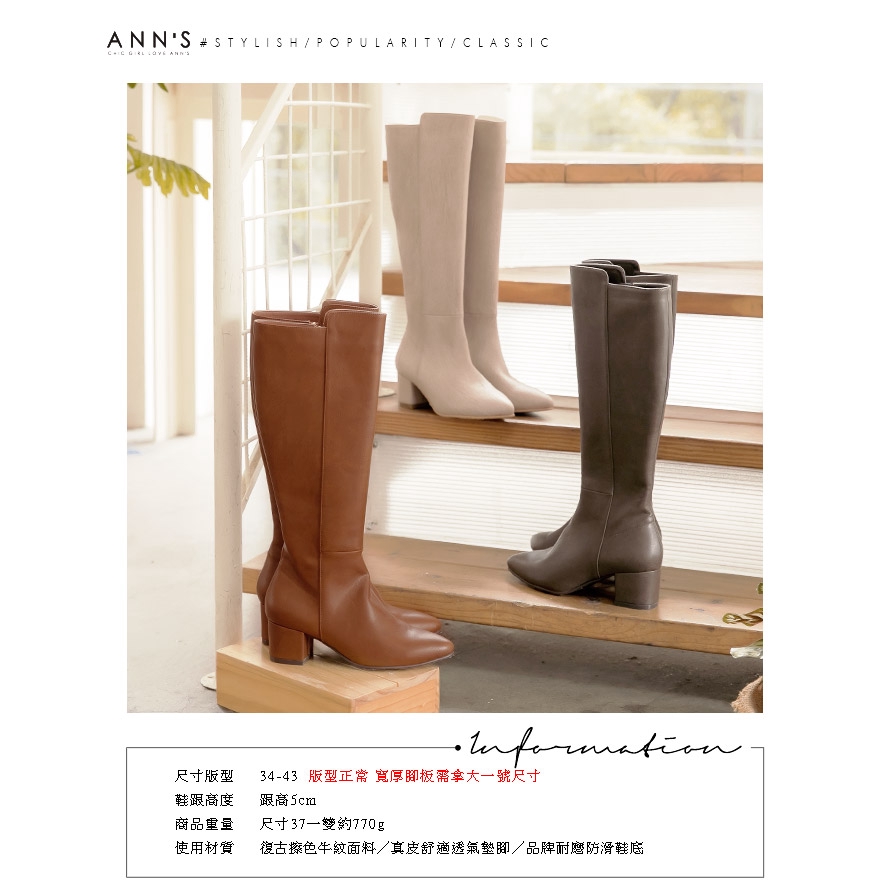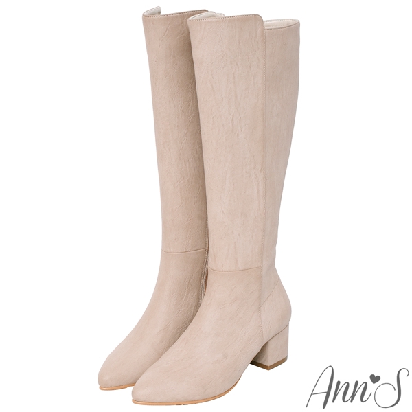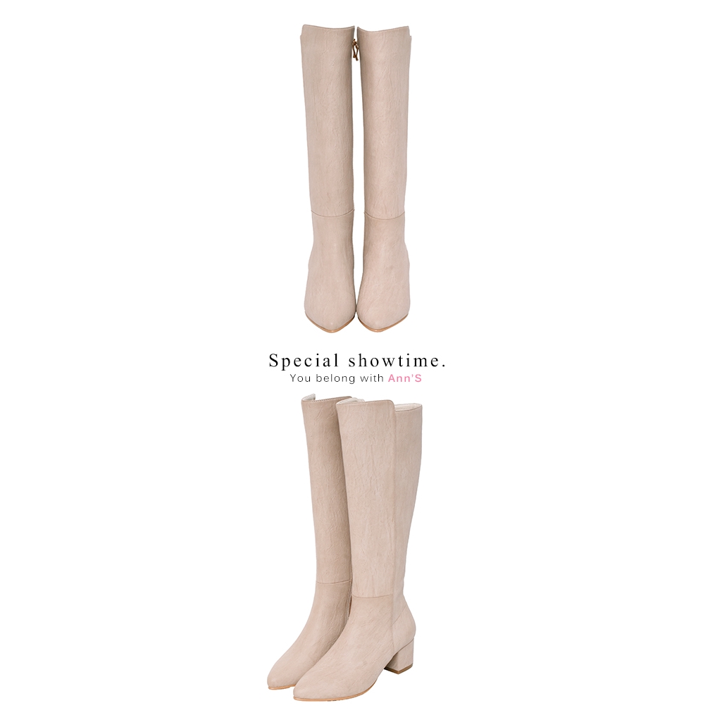 Ann’S返璞經典-復古皮革前高後低粗跟及膝長靴5cm-杏
