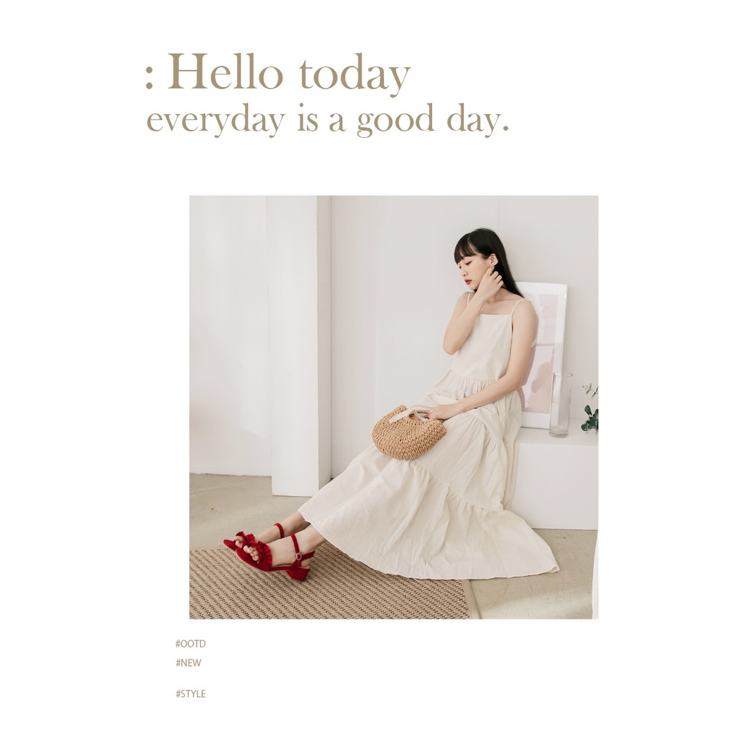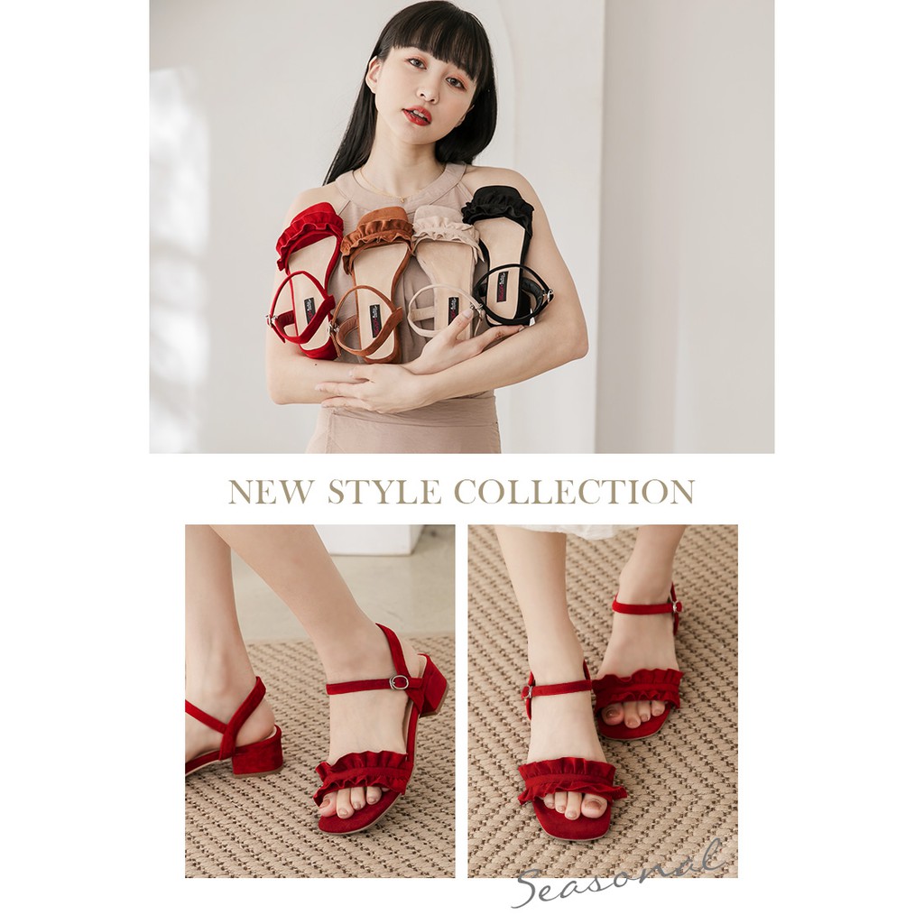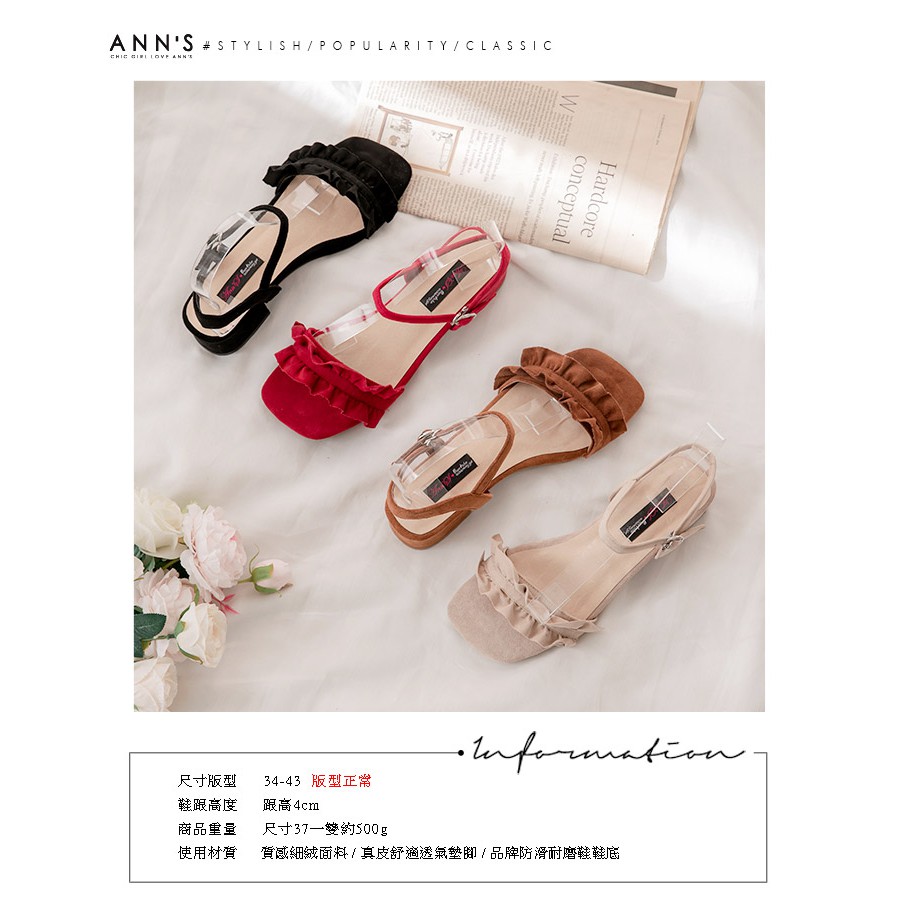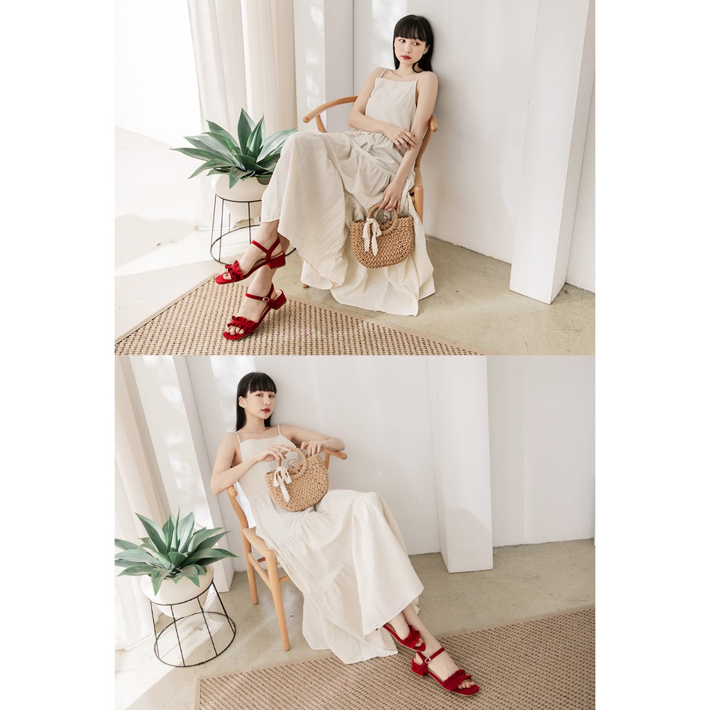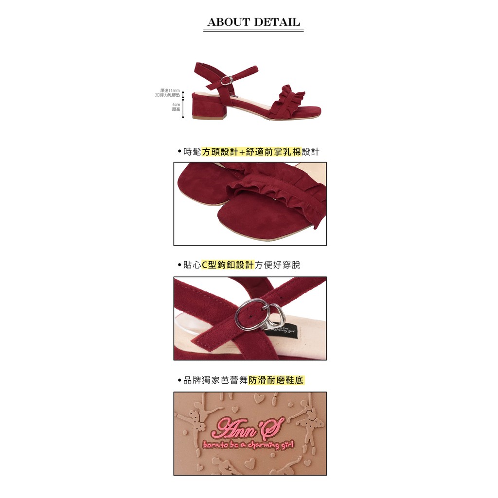 Ann’S可愛木耳花邊-素面細絨側V顯瘦一字粗跟涼鞋4cm-紅