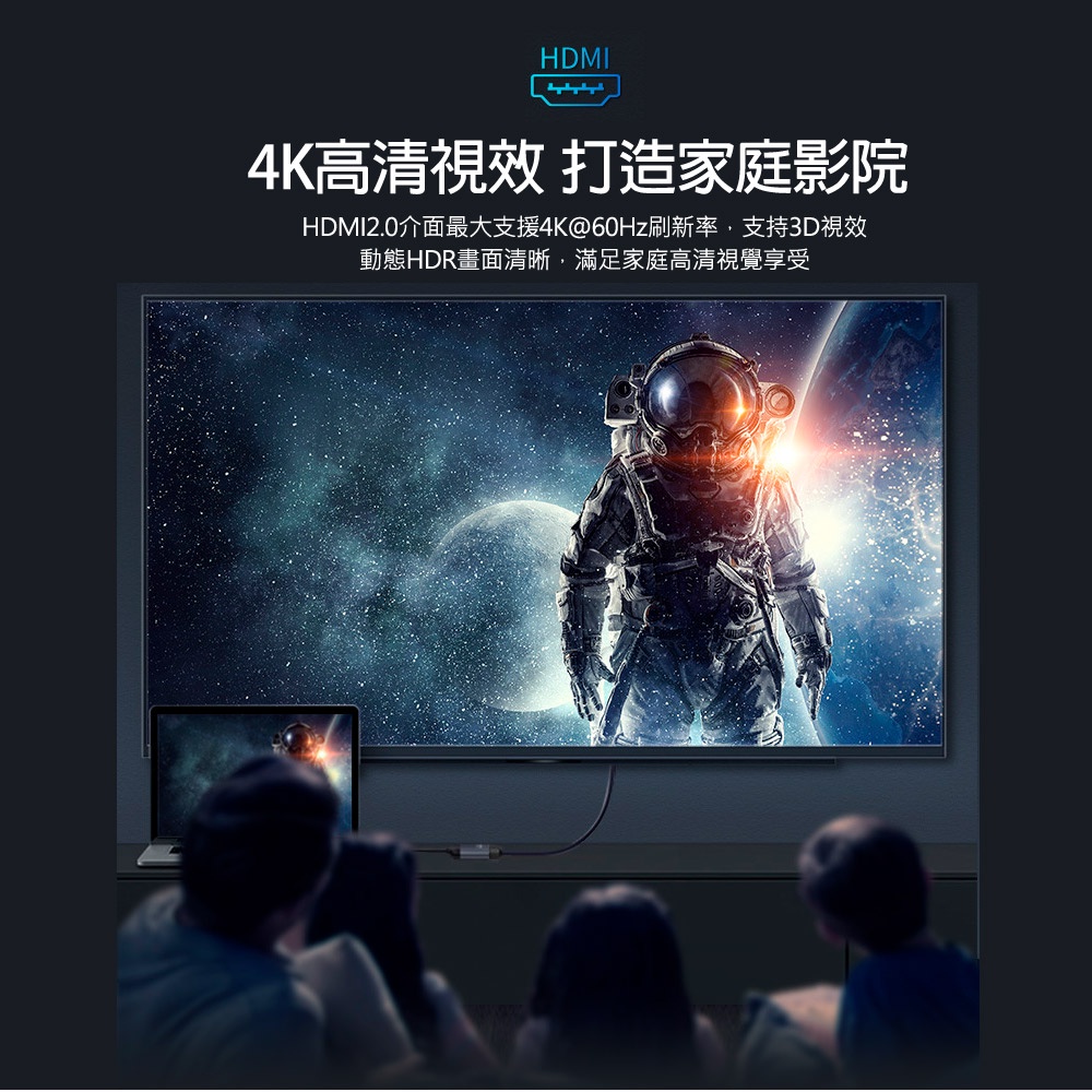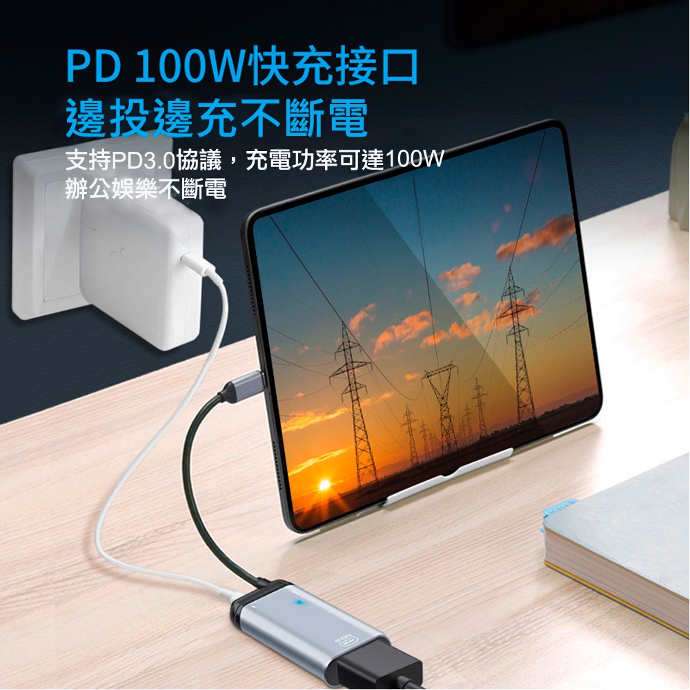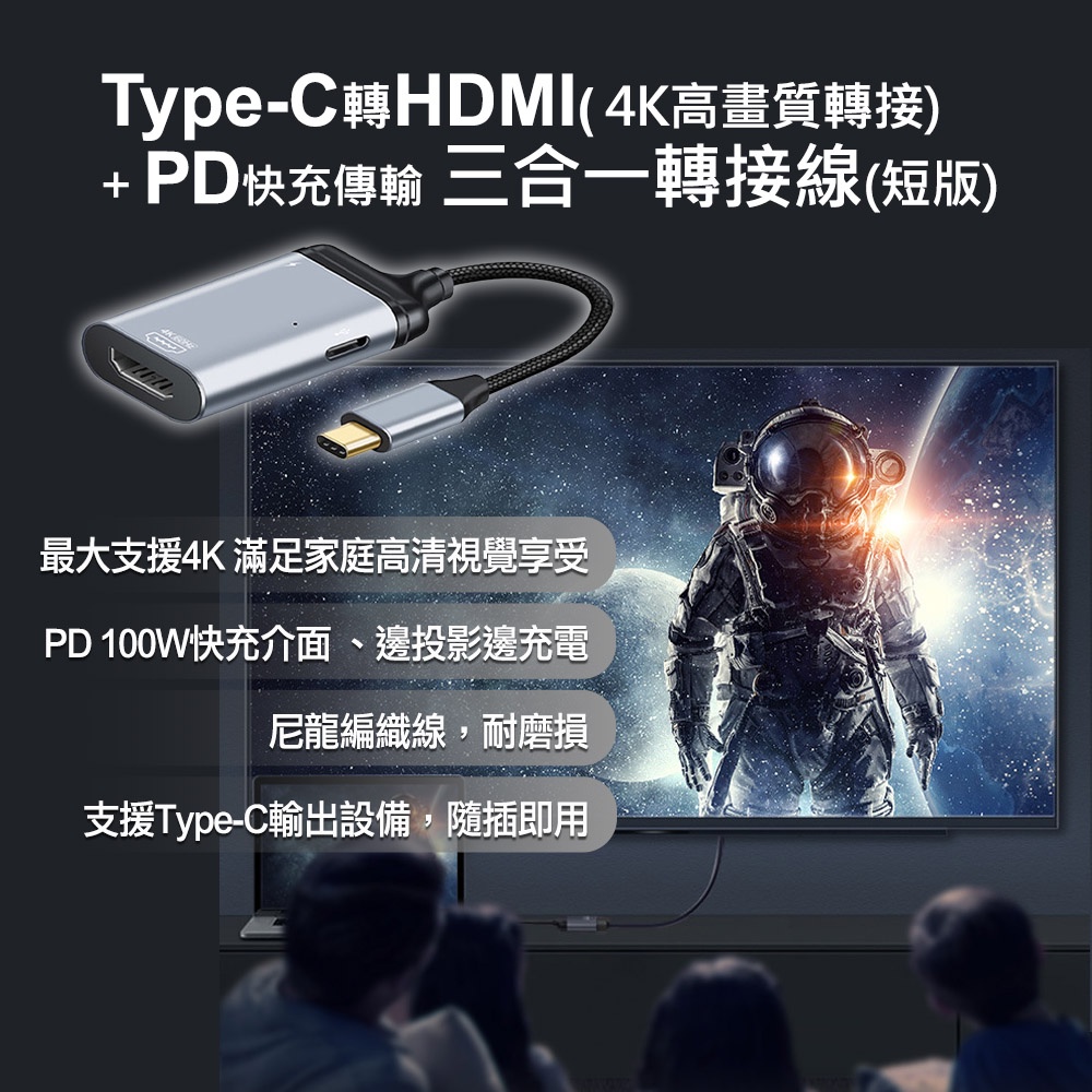 【atake】Type-C轉HDMI 4K高畫質轉接+PD快充傳輸 三合一轉接線(短版)