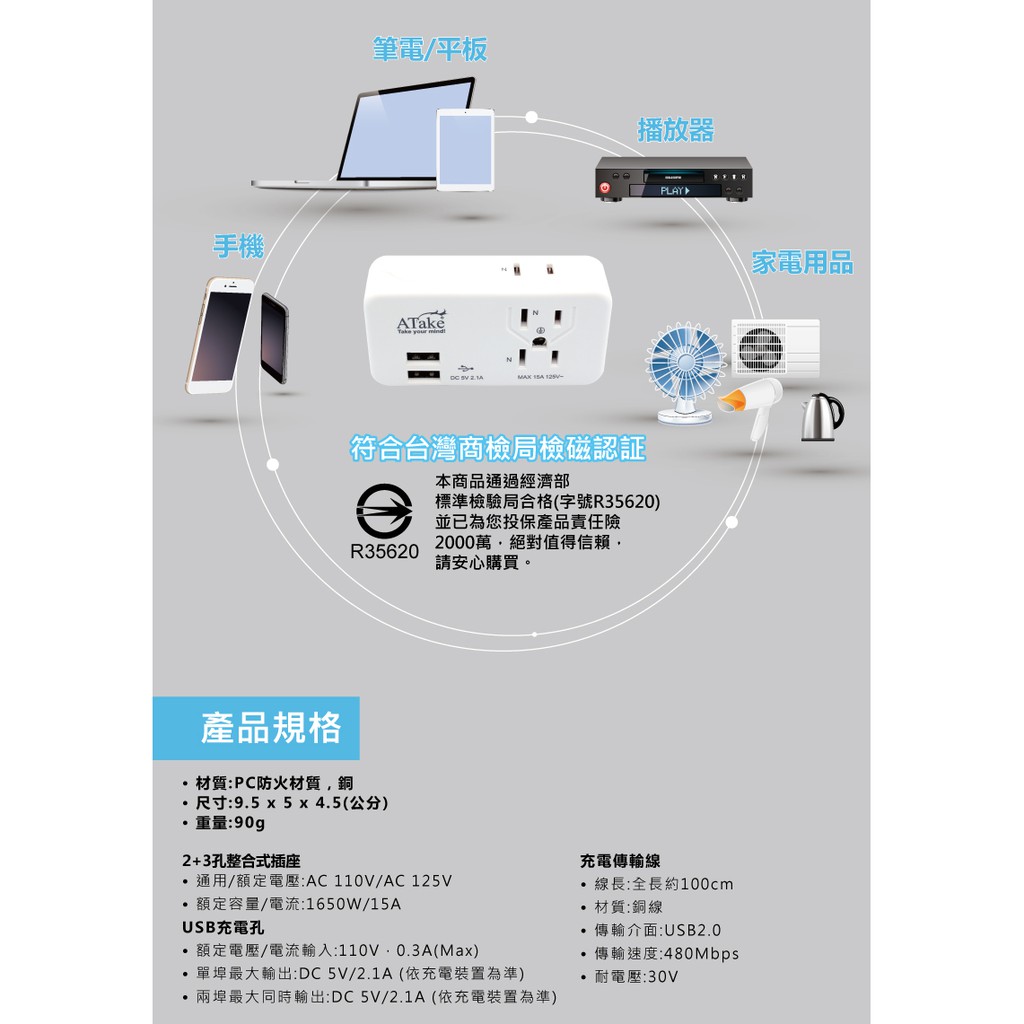 【atake】3座2+3孔USB擴充座2.1A充電頭(贈)MicroUSB充電傳輸線 充電座/傳輸線/擴充座