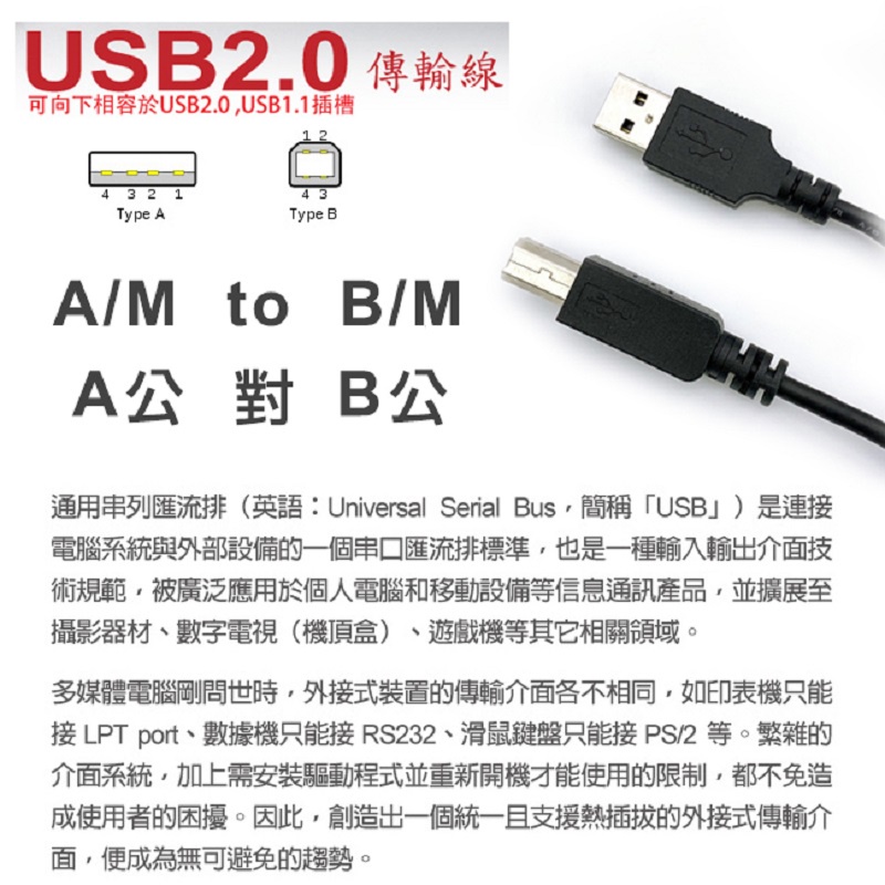 【atake】USB2.0 Type-A公轉Type-B公印表機傳輸線 1.8m XP-420 XP-460 標籤機