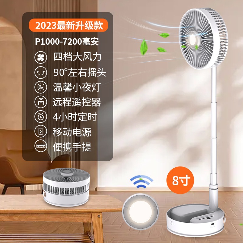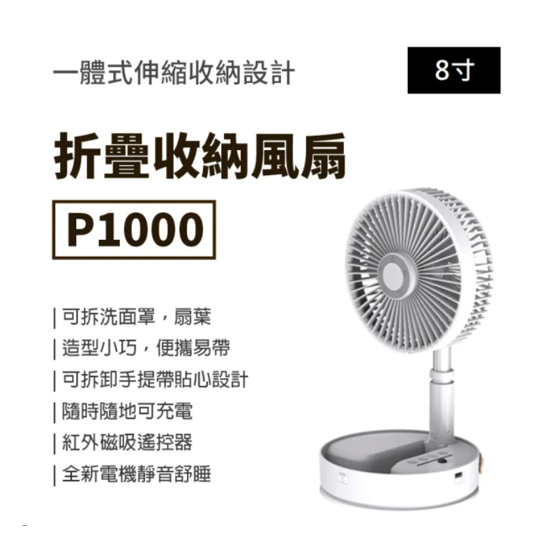 P10-1000 折疊風扇 8吋 USB充電風扇摇头、遥控、电量显示屏、定时、小夜灯、折叠收纳 靜音風扇 伸縮摺疊風