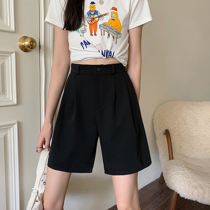 【HOT 本舖】S-2XL 夏季新款韓版高腰百搭休閒褲寬鬆闊腿褲短褲女裝褲子 杏色西褲 白色西褲 西裝短褲女