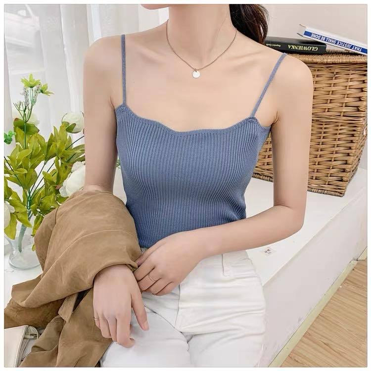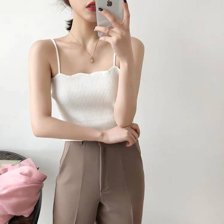 【HOT 本舖】小吊帶女夏外穿復古港味配西裝無袖上衣韓版簡約內搭打底針織背心 花邊設計低領小性感細肩帶針織背心女