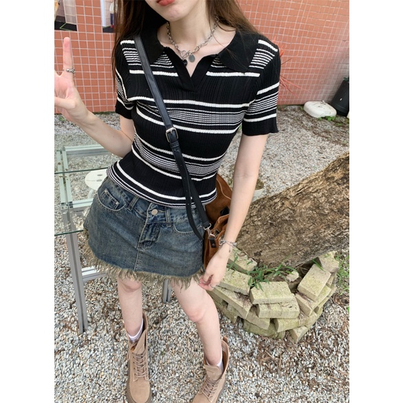 【HOT 本舖】條紋針織衫 翻領上衣 短版上衣 修身顯瘦別致上衣 夏季bm風正肩短袖T恤女 氣質上衣 ins風