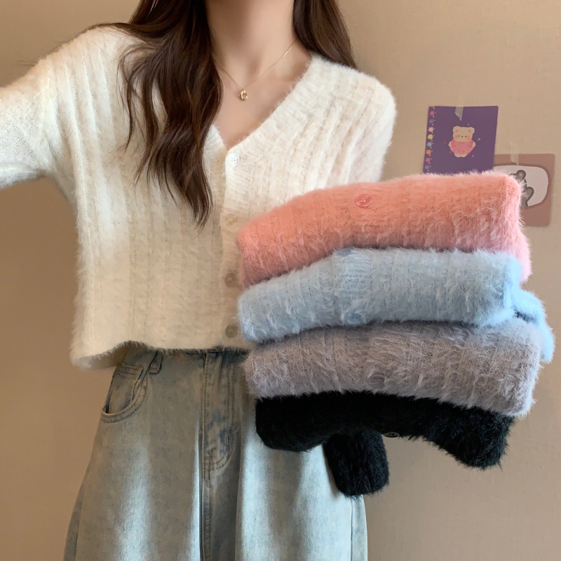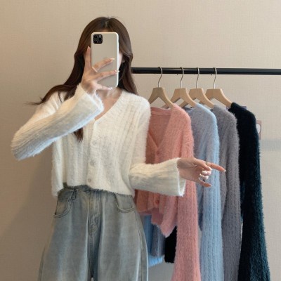 【HOT 本舖】秋冬季新款百搭顯瘦開衫 針織衫 性感毛毛毛衣女 短版毛衣外套 毛絨絨毛衣 顯瘦百搭 V領上衣 長袖外套