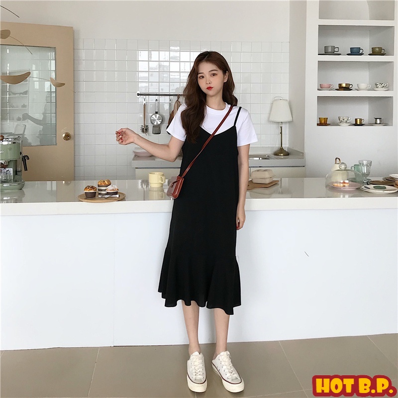 【HOT 本舖】韓版洋裝女 吊帶長裙 純黑色 魚尾裙 中長款 裙子 夏季新款 學生 女生衣著 簡約百搭 學院風