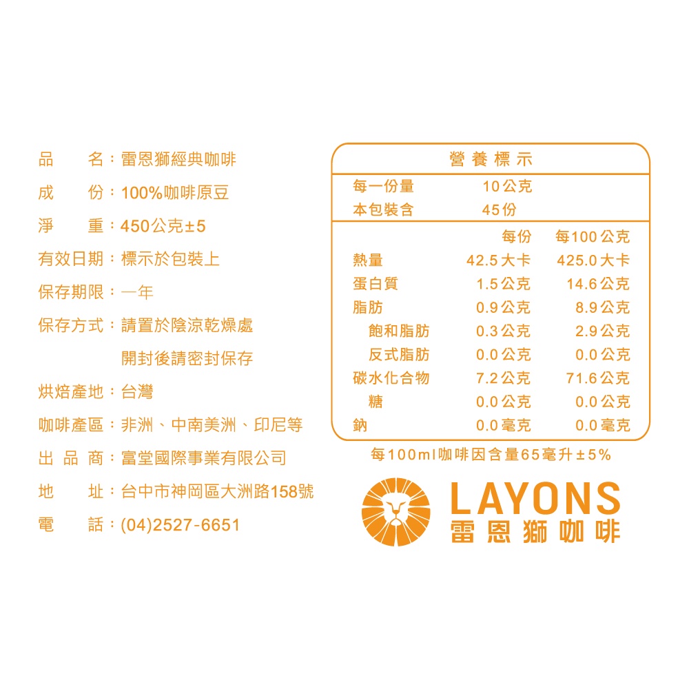 LAYONS 雷恩獅 | 咖啡豆 曼特寧 風味 經典系列 中深焙 城市烘焙 自家烘焙 新鮮 義式 1磅 一磅 450g