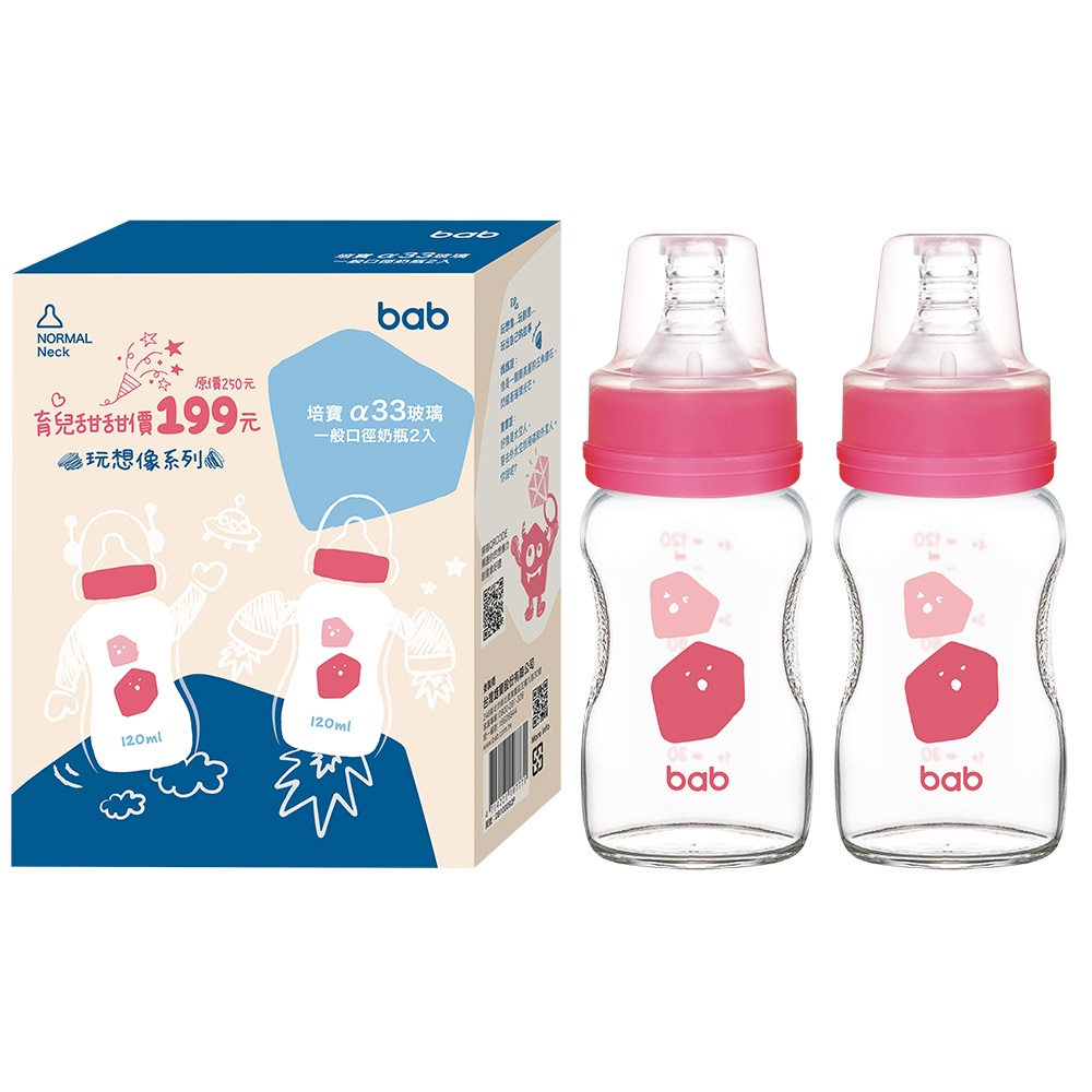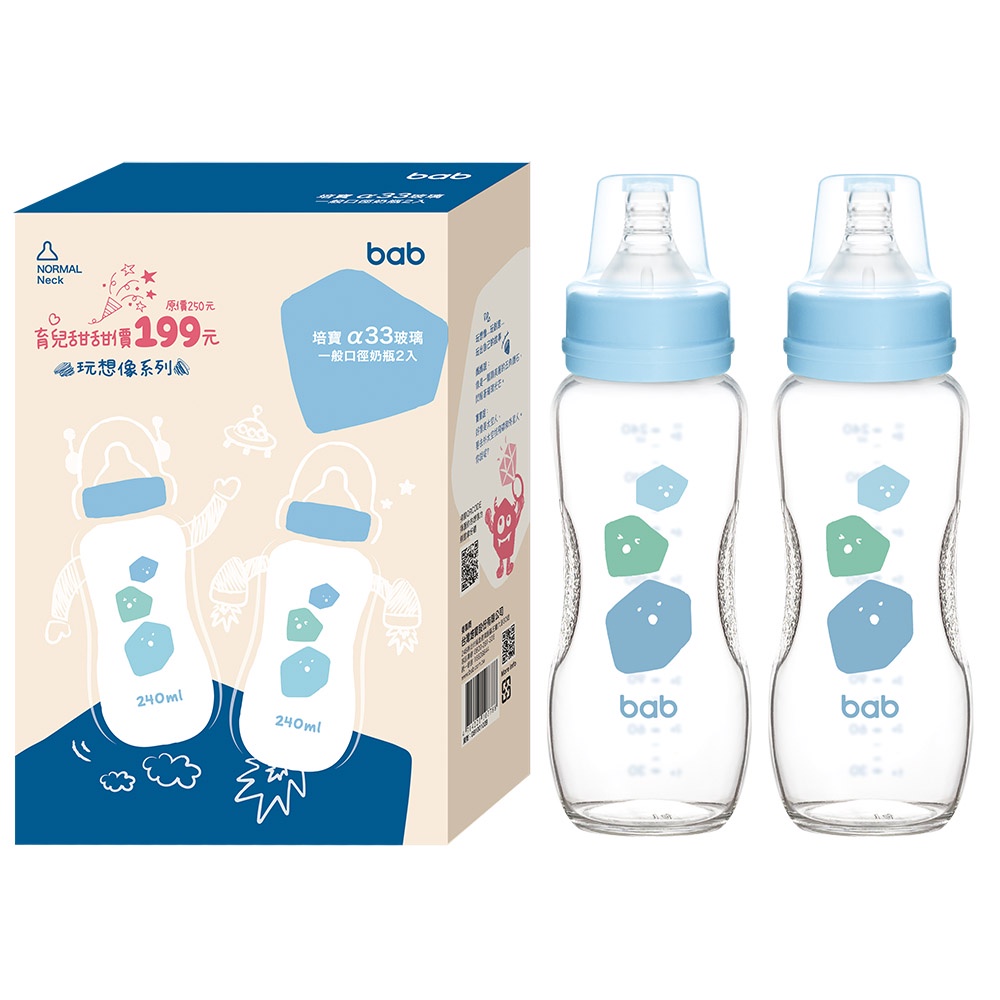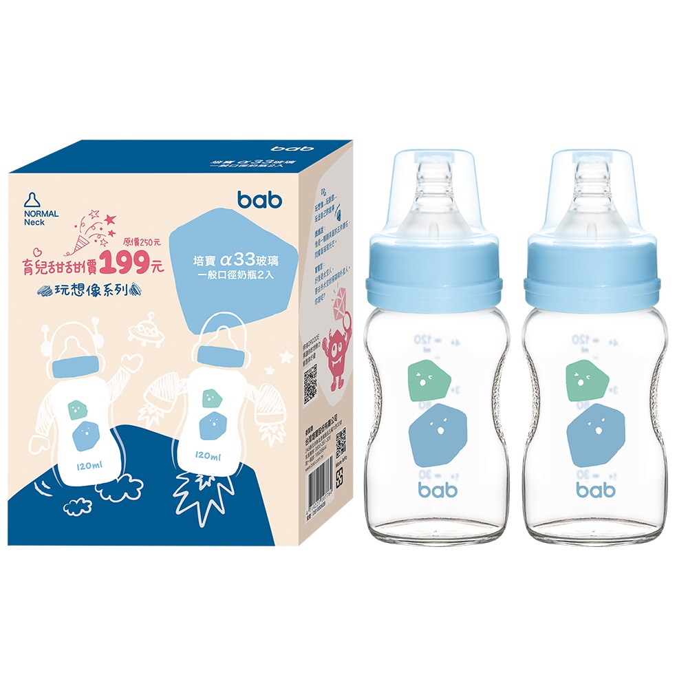 bab培寶 α33玻璃奶瓶2入一般口徑(120ml/240ml-藍/粉)