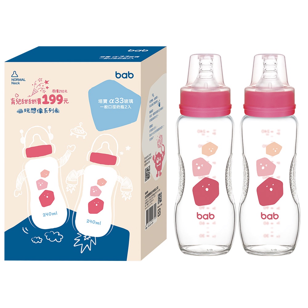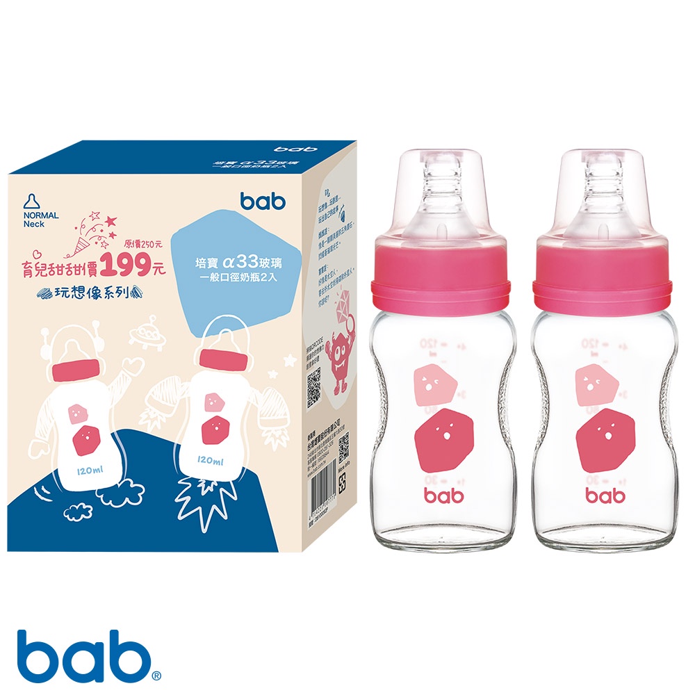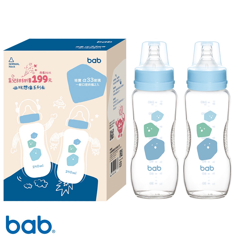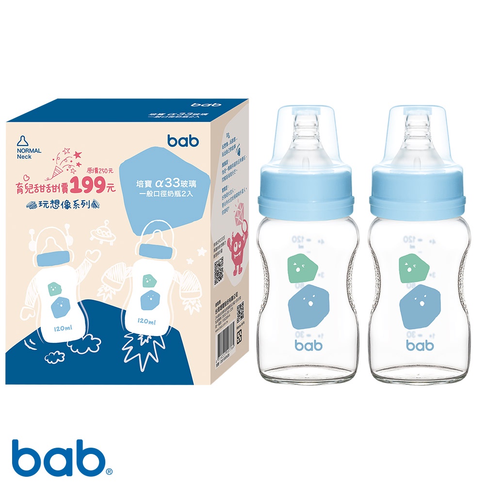bab培寶 α33玻璃奶瓶2入一般口徑(120ml/240ml-藍/粉)