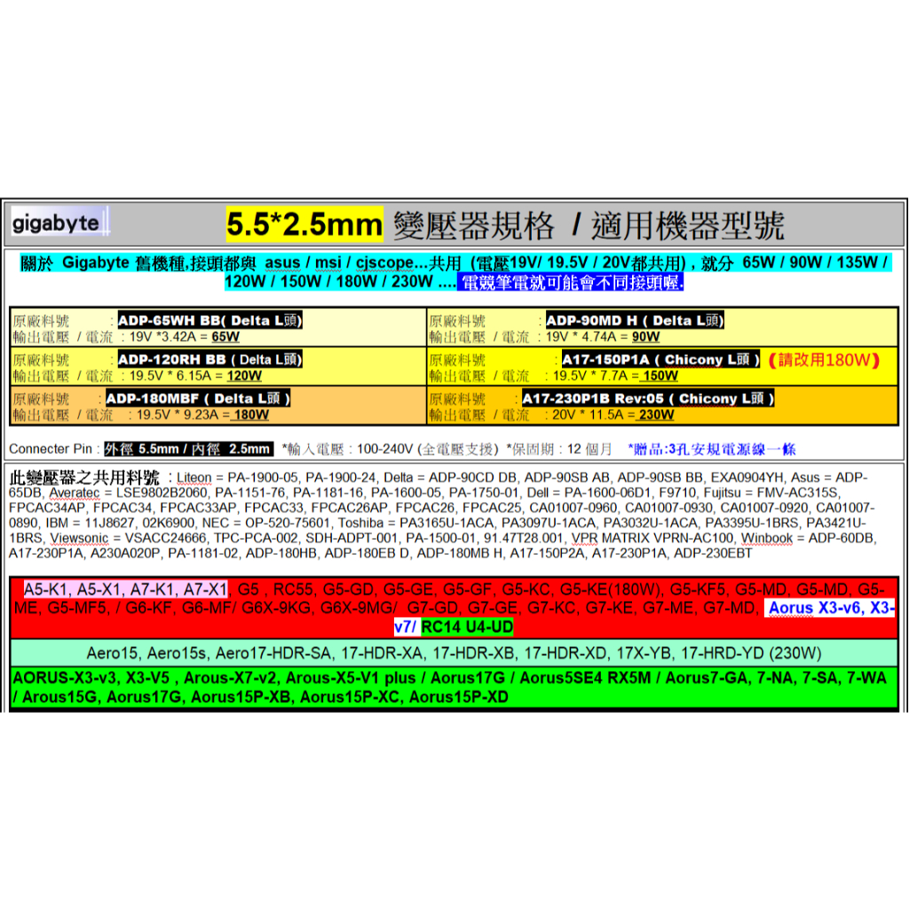 gigabyte 技嘉 筆電 充電器 變壓器 65W 90W 120W 150W 180W 280W 5.5*2.5mm
