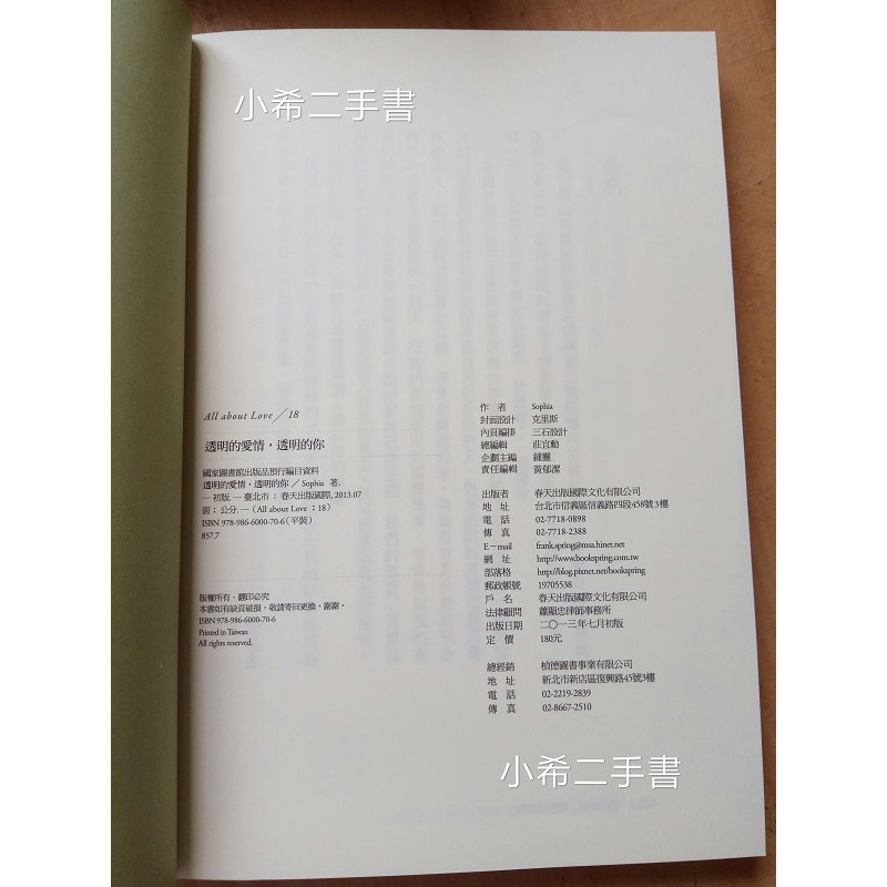 近全新【現貨】透明的愛情,透明的你 Sophia 春天出版 自有書 愛情故事 言情小說 閱讀心得 二手書