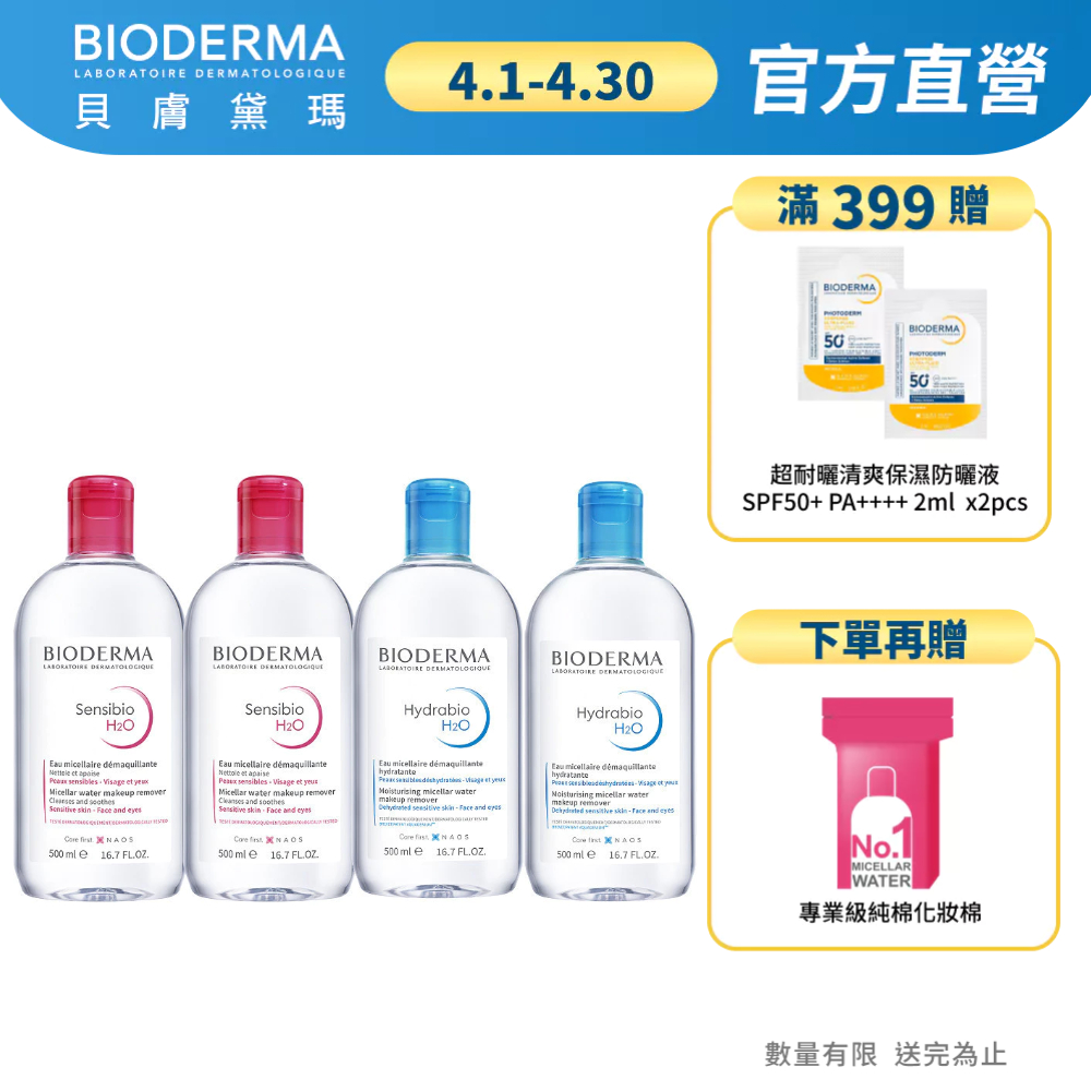 【BIODERMA 貝膚黛瑪】潔膚液500mlx4入組 (舒敏/保濕/平衡3款任選) 官方直營 贈:純棉化妝棉