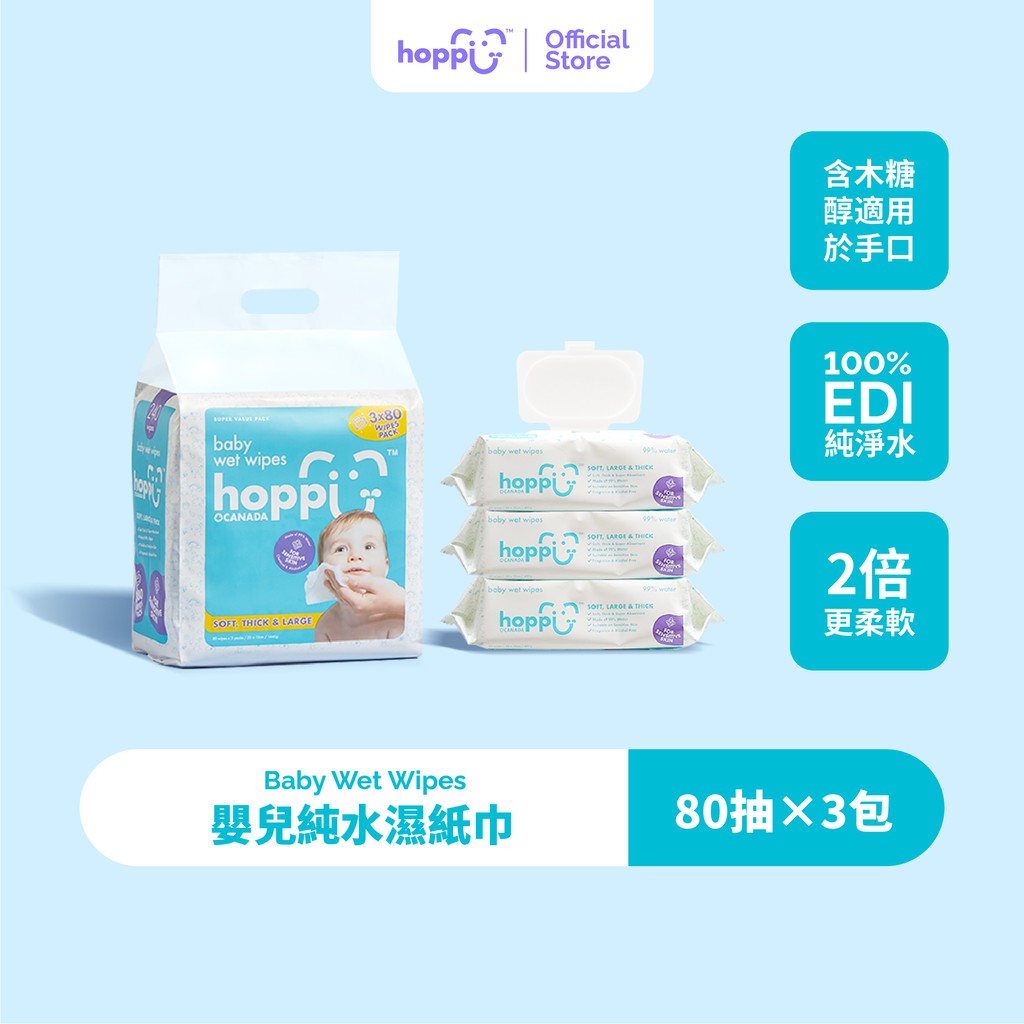 【蝦皮直營】Hoppi純水嬰兒濕紙巾加厚加蓋款 無酒精無香精 80抽x3包升級款 手口濕巾 99%純EDI水