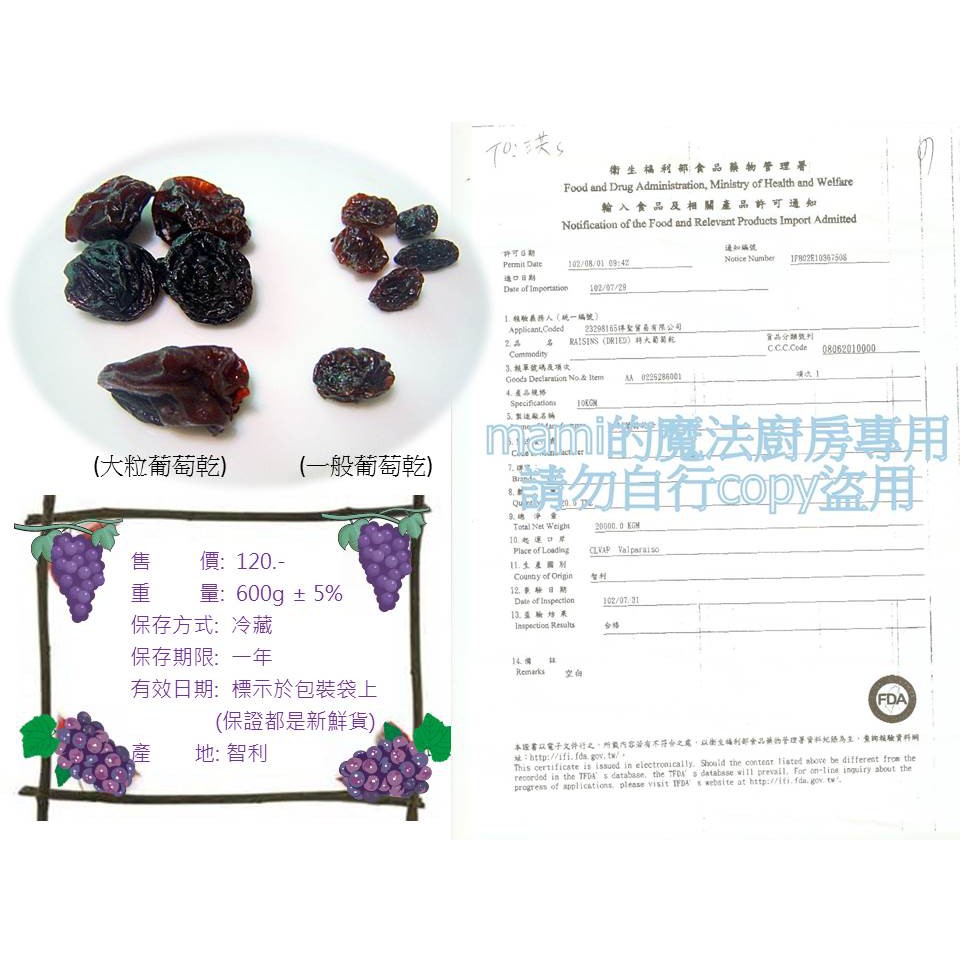 無子 大葡萄乾(600g/智利)無添加防腐劑,嚴選大顆全果粒葡萄*成長中小孩及女性優質補充品☆ mami的魔法廚房