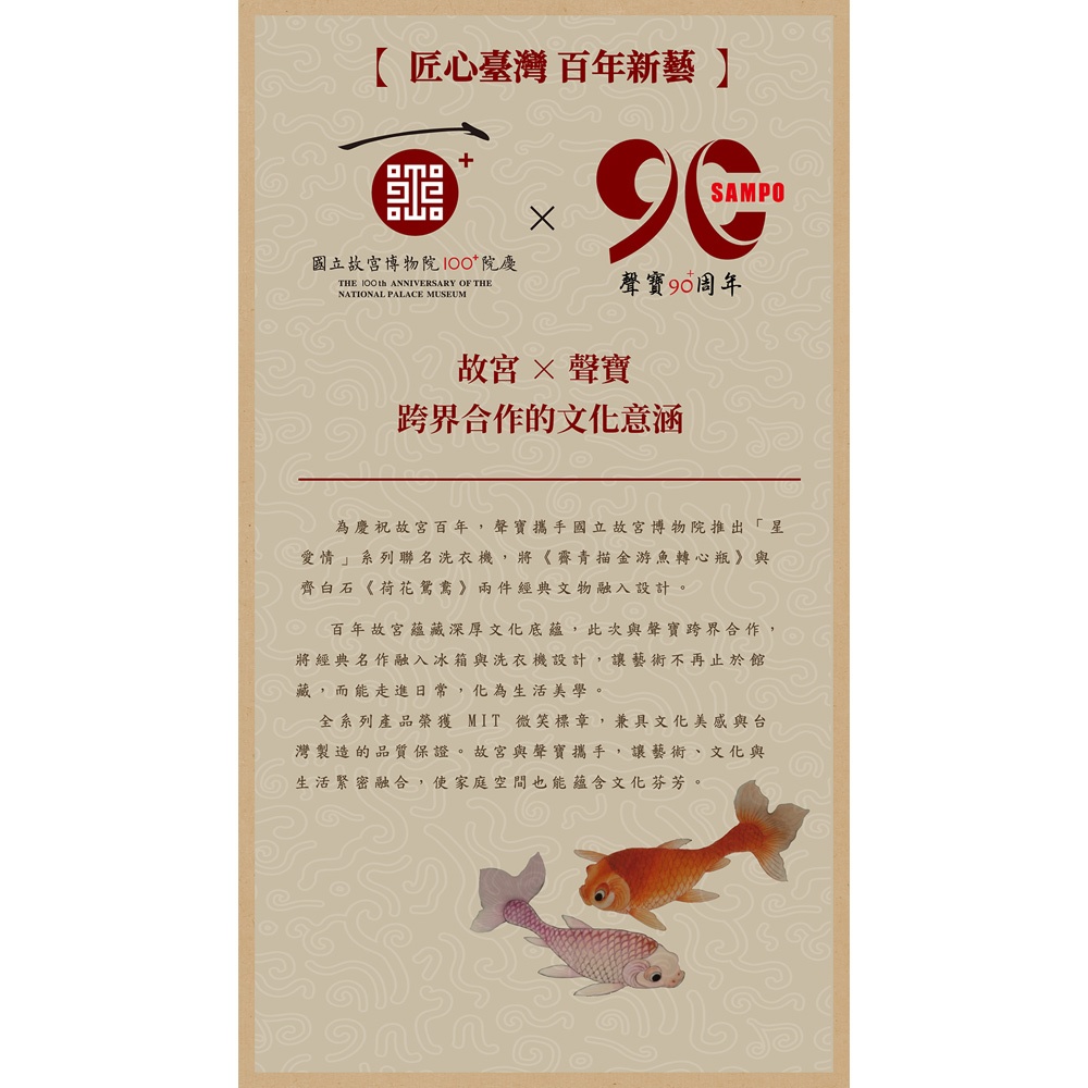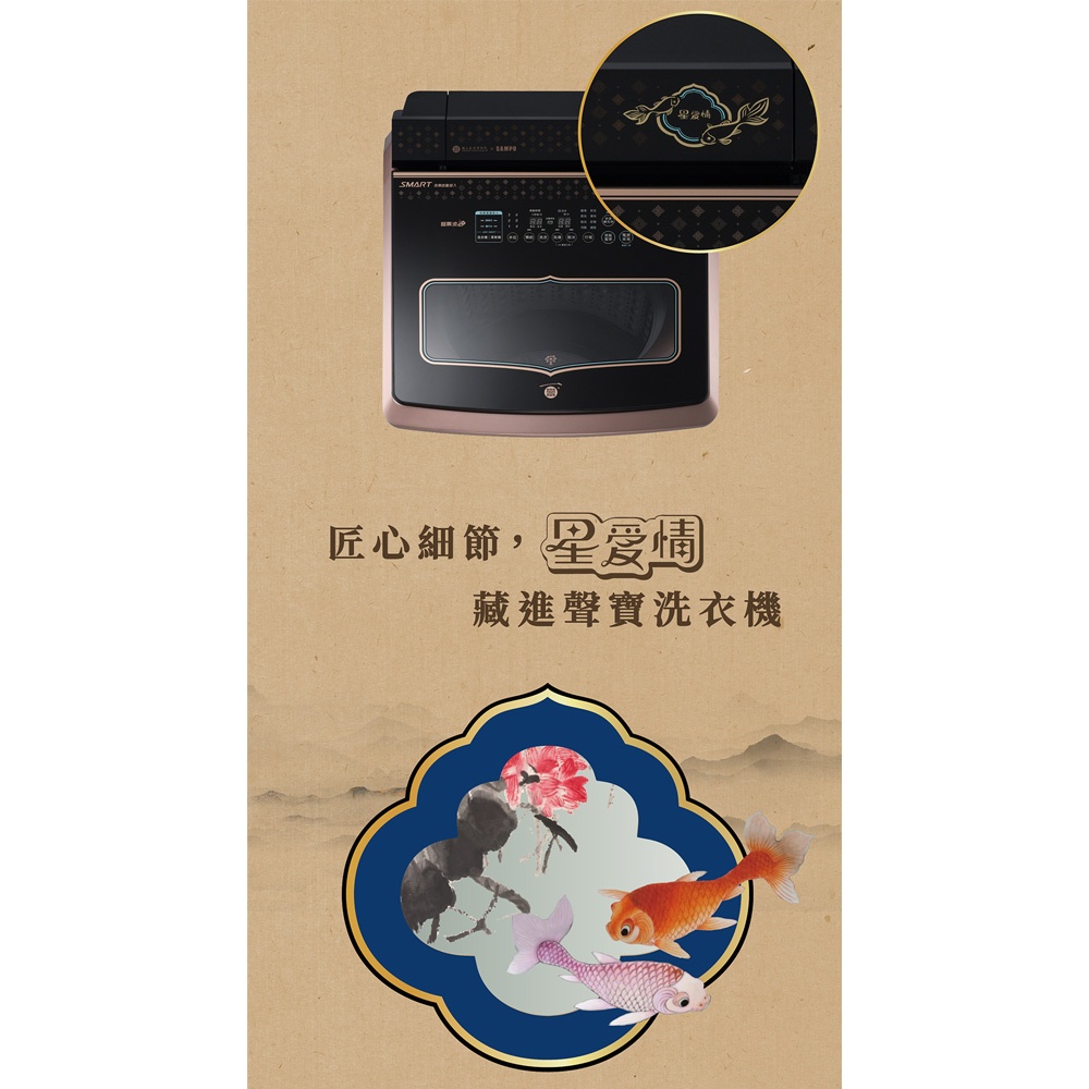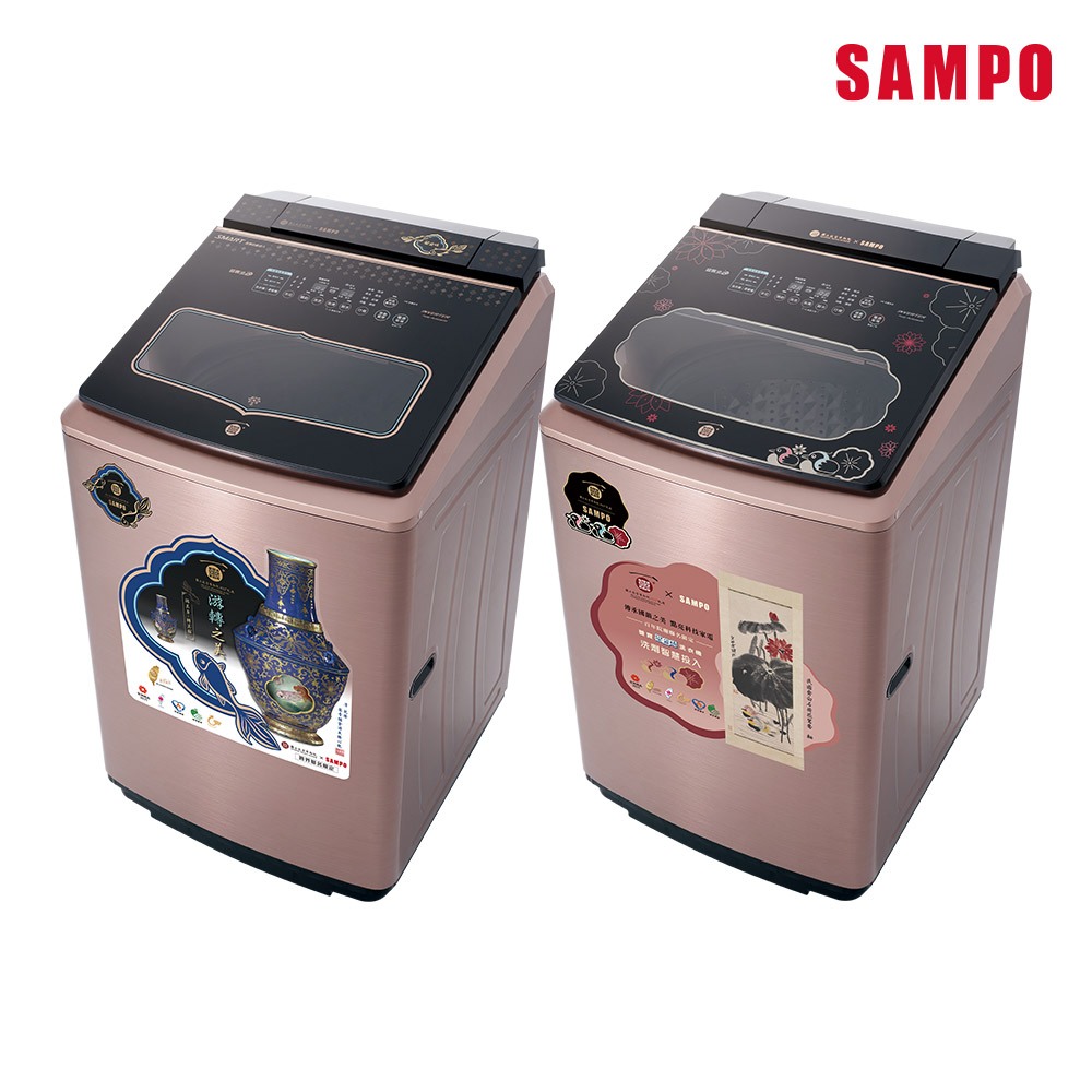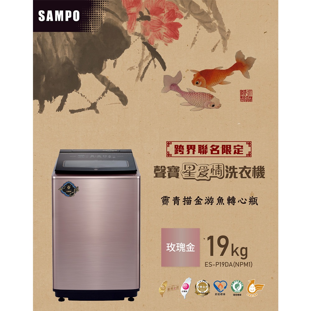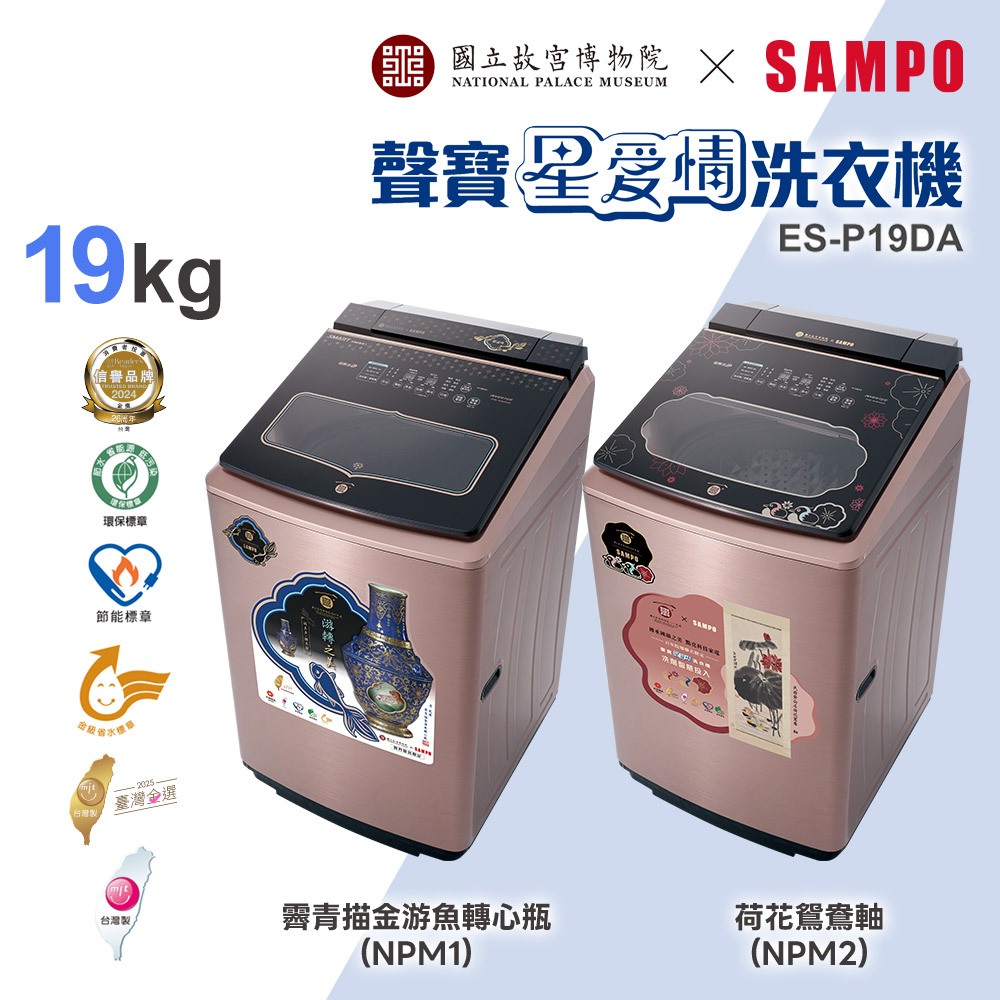 SAMPO聲寶 故宮聯名款19kg洗劑智慧投入變頻洗衣機-露青描金游魚轉心瓶/荷花鴛鴦軸 ES-P19DA(NPM1)