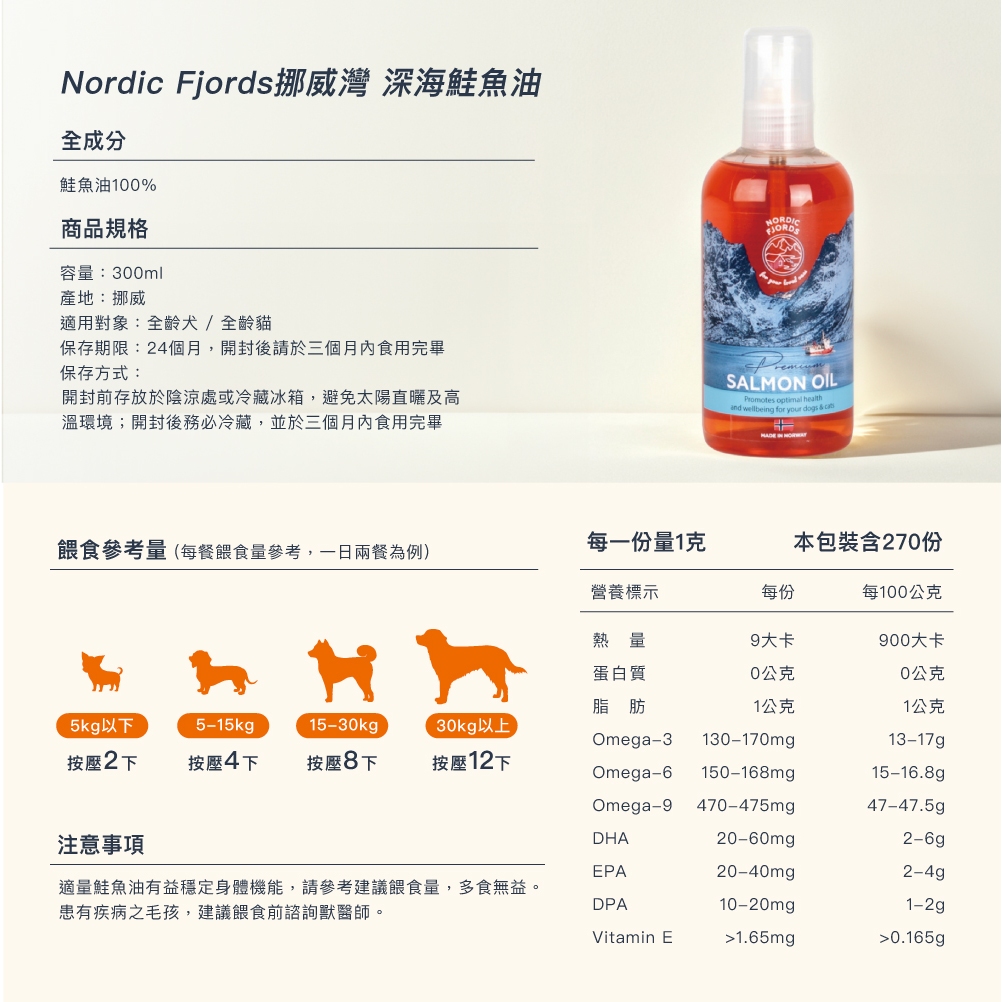 【Nordic Fjords挪威灣】100%挪威原裝進口寵物魚油300ml防UV噴頭裝(貓魚油/狗狗魚油/挪威純鮭魚油)