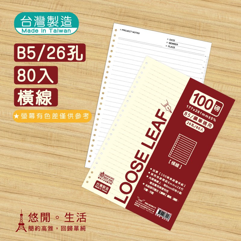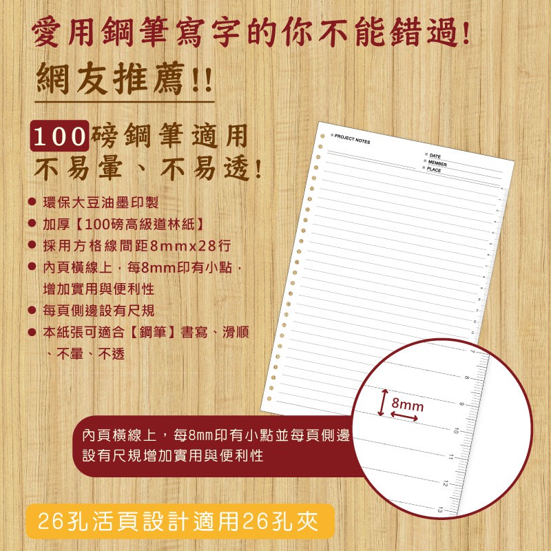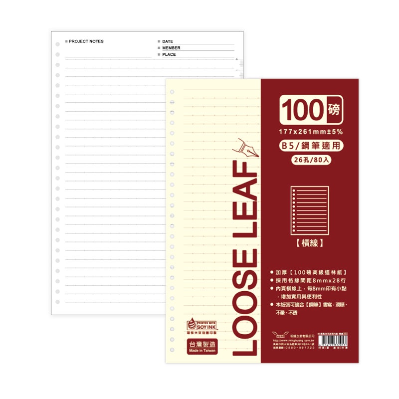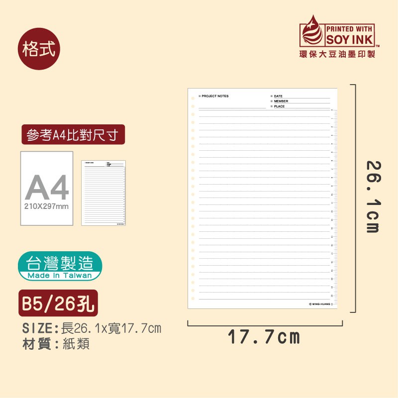 明鍠 B5 18K 素雅 26孔 活頁內紙 素雅 橫線 100磅鋼筆適用