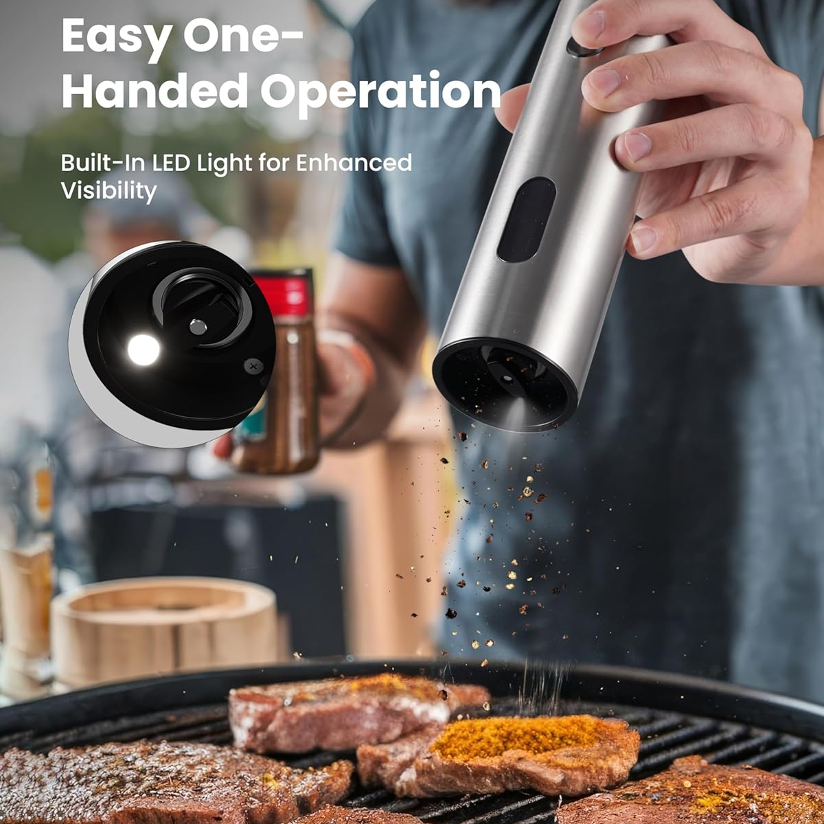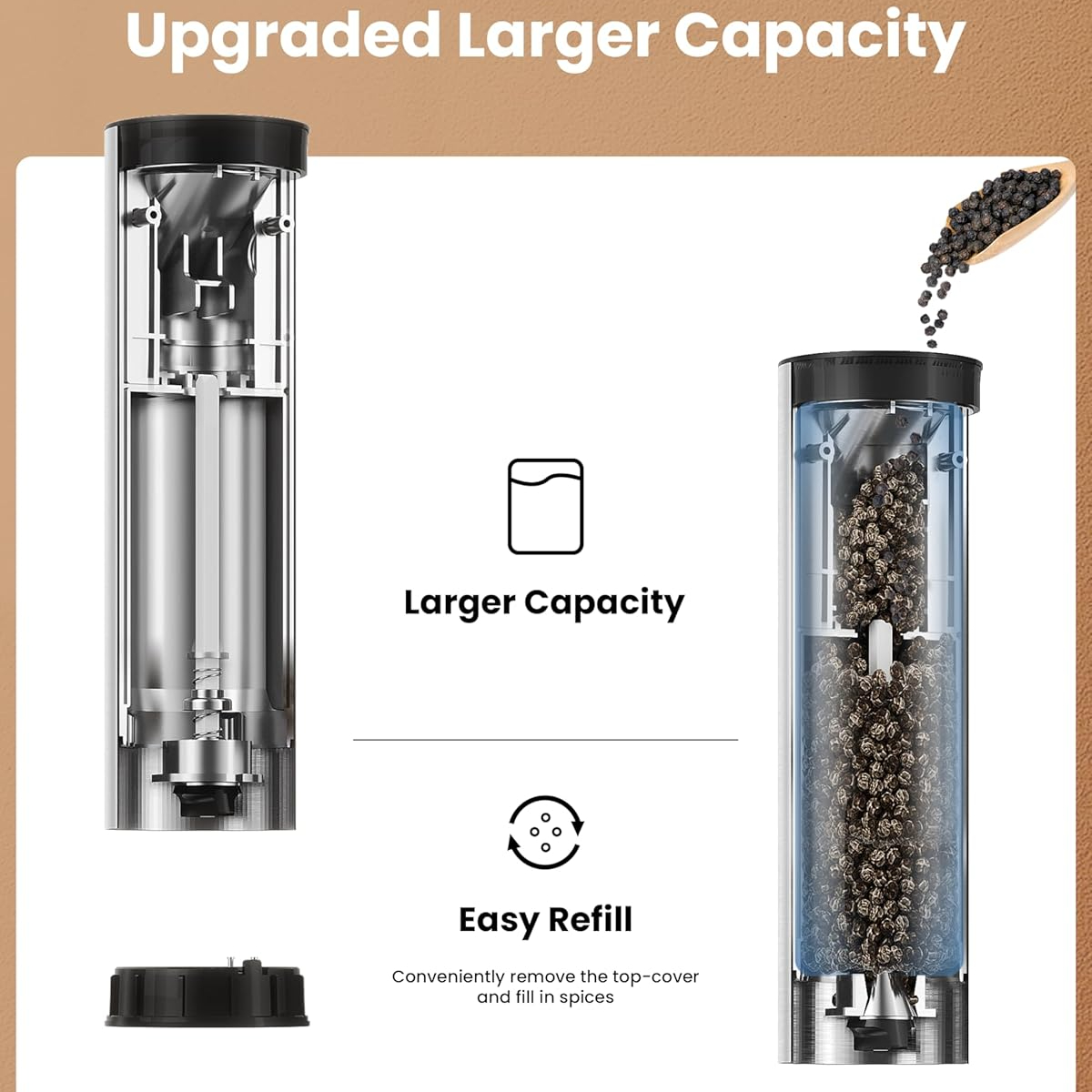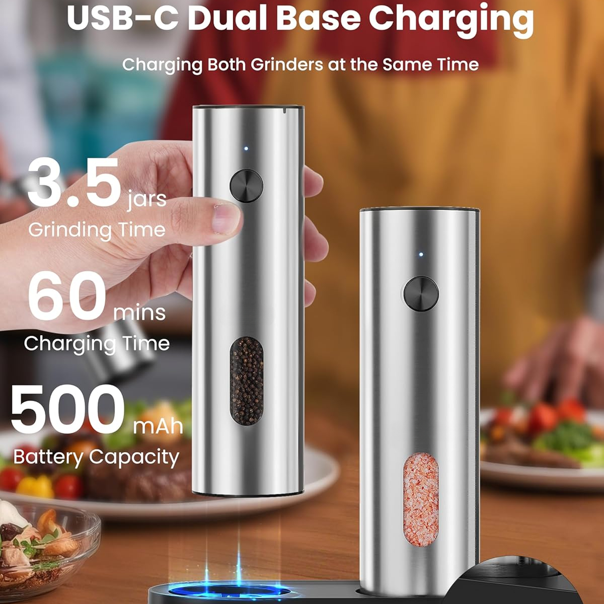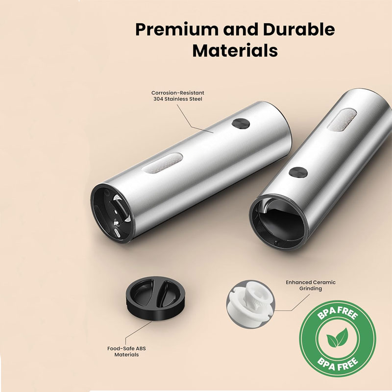 電動鹽和胡椒研磨器組,附可充電底座 - 大容量、可補充、LED燈、可調粗細
