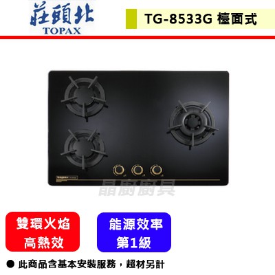 【莊頭北 TG-8533G】瓦斯爐 檯面式瓦斯爐 保潔三口玻璃檯面爐(黑玻璃)(鑄鐵爐架)(部分地區含基本安裝)