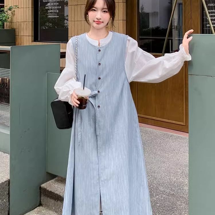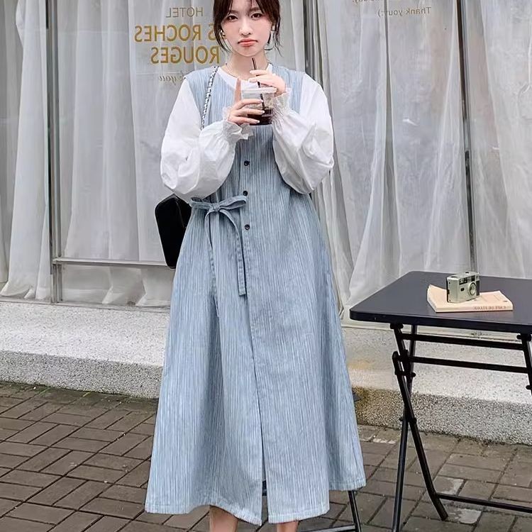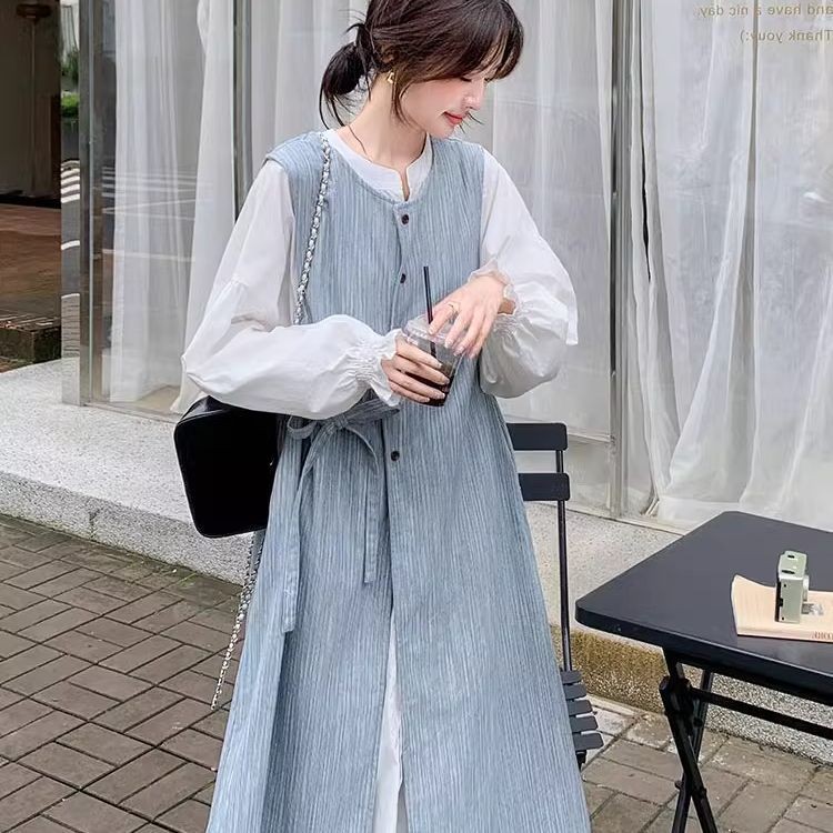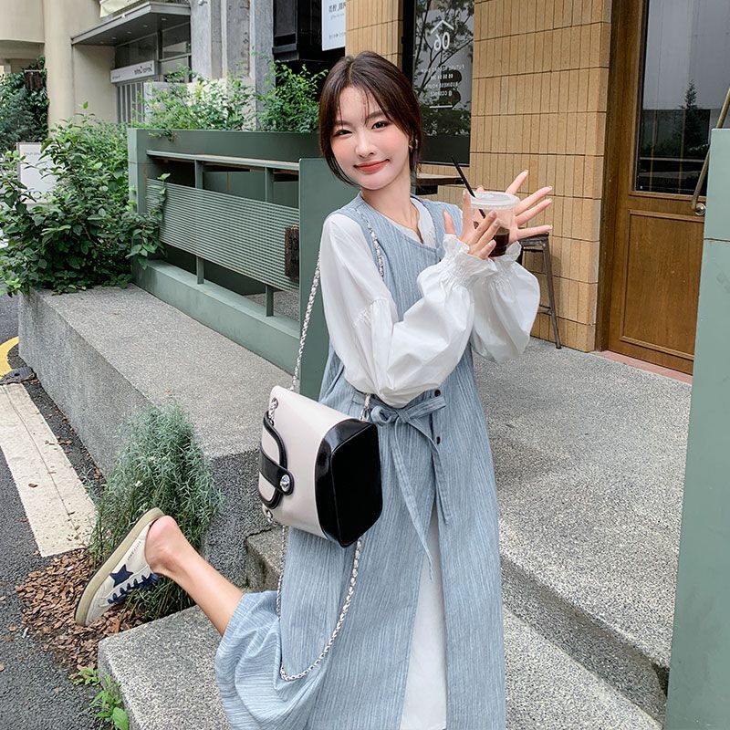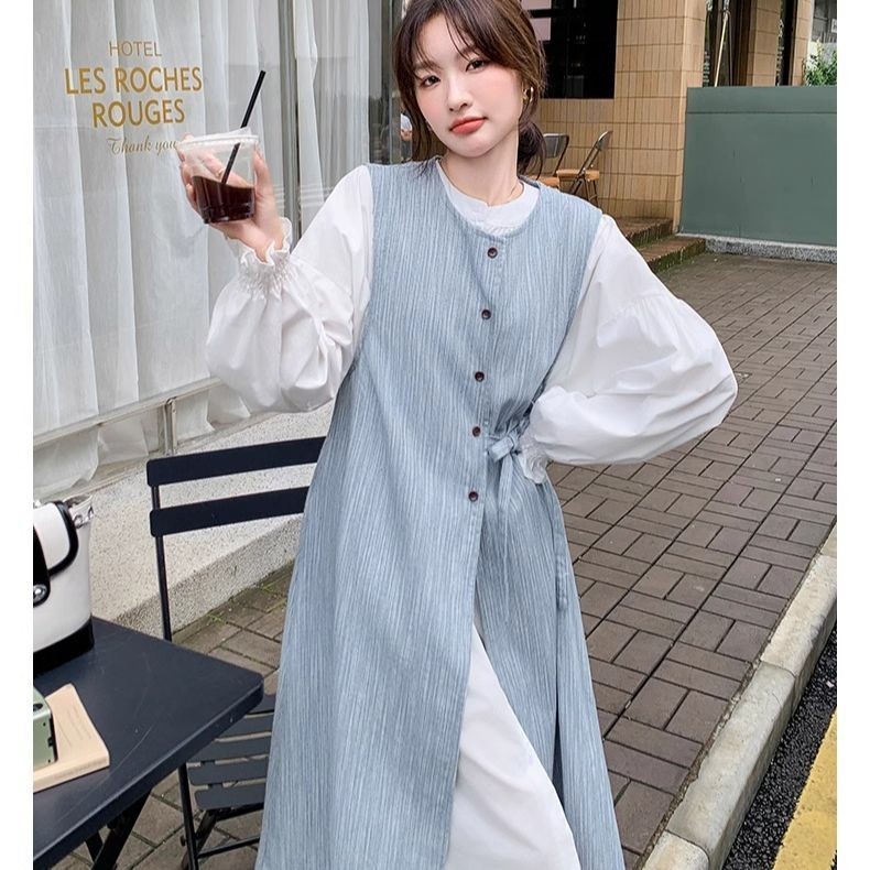 時尚女裝 連衣裙 長裙 清純甜美一整套穿搭女春款新款韓繫條紋背心泡泡袖長裙兩件套 氣質 淑女 裙子