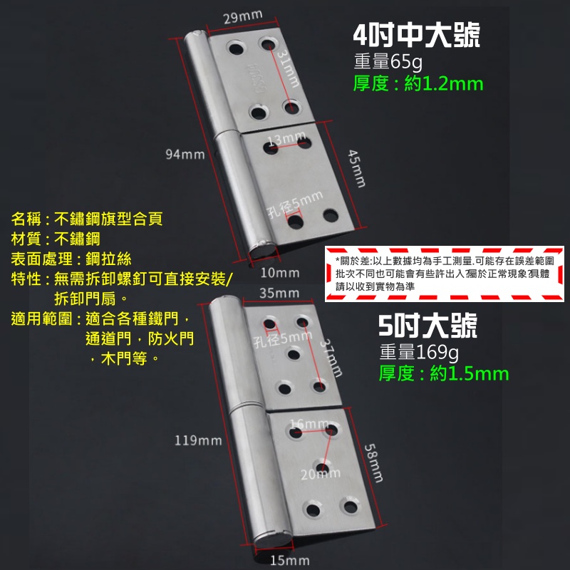 【台灣現貨】304不鏽鋼可拆式旗型合頁[單片](2.5/3/4/5吋 四款可選)#可拆卸合頁 鉸鏈門 旗形合頁 脫卸合頁