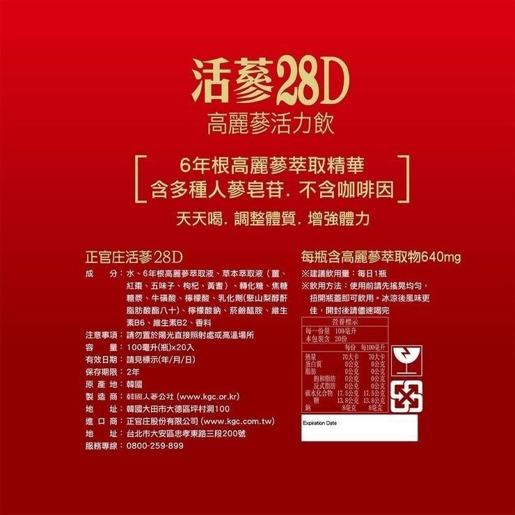 正官庄 活蔘28D高麗蔘活力飲 100毫升 X 20瓶#86999